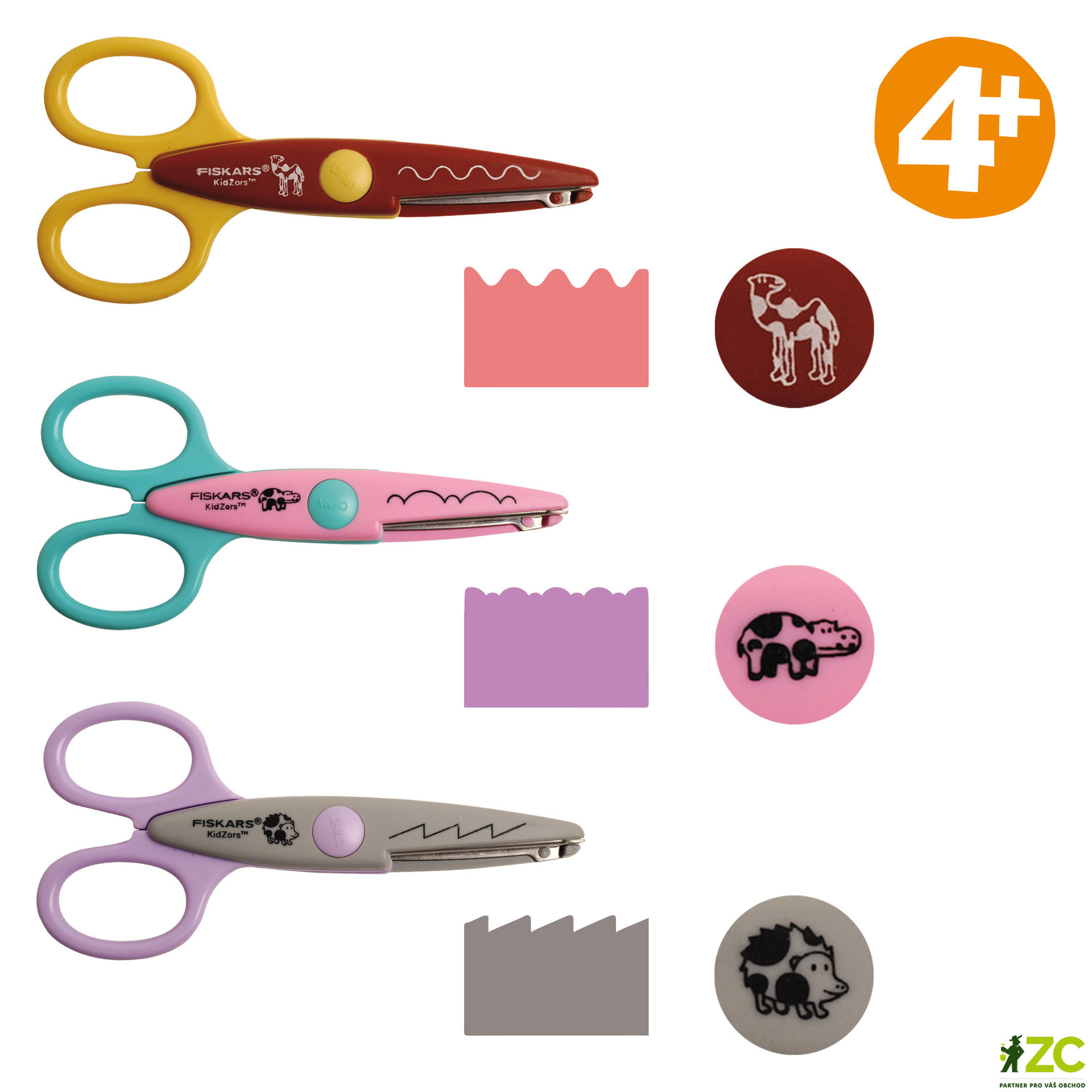Dětské nůžky jsou určené pro snadné vystřihování dekorativních okrajů (vlnky, zoubky atp.) s designem hrocha, velblouda a ježka. Barevná držadla jsou speciálně tvarovaná pro dětskou ruku (4+ let). Čepele jsou vyrobeny z kvalitní nerezové oceli, jsou zaoblené pro větší bezpečnost. Jsou vhodné pro praváky i leváky. Délka: 13 cm. 3 ks nůžek.