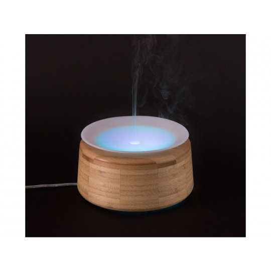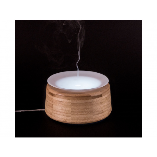 Zvlhčovač vzduchu s difuzérem vyrobený z přírodního bambusového dřeva. Aromatizuje a zvlhčuje vzduch kombinací účinků vodní mlhy a esenciálních olejů. Pomocí jemného ultrasonického vlnění rozkládá esenciální oleje na extrémně malé mikročástice, aniž by je zahříval. Oleje si tak zachovávají původní vůni i léčivé účinky. Aroma difuzér vám pomůže vytvořit z každého pokoje vonící oázu a navodit relaxační atmosféru.Bez přidání esenciálního oleje vám aroma difuzér poslouží jako zvlhčovač vzduchu. Přidáním konkrétního esenciálního oleje můžete sobě, nebo vašim blízkým pomoci s různými obtížemi. Postačí pár kapek kvalitního oleje a můžete ulevit rýmě, kašli, bolestem hlavy, nebo špatnému usínání. Správně zvolený olej vyčistí vzduch, nebo vám jednoduše zpříjemní pobyt v místnosti, ve které se právě nacházíte.Díky neutrálnímu designu z bambusového dřeva stylově doplní vybavení všech obytných prostor, dětských pokojů, jednacích místností, masážních salónů, wellness center apod. Do horní misky difuzéru může položit květiny, okvětní lístky nebo okrasné kameny. Vhodně zvolenými esenciálními oleji můžete podpořit relaxační atmosféru v ložnici, dezinfekci vzduchu či klidný spánek v dětském pokoji. Koncentraci v pokoji studenta anebo uvolněnou komunikaci, ať už doma nebo v pracovním prostředí.Používejte vždy kvalitní oleje. Použitím levných, umělých olejů sice vytvoříte voňavé prostředí, ale tělo a mysl si neodpočinou. Citlivým osobám může naopak uškodit. Například bolestí hlavy apod.Během provozu aroma difuzéru lze libovolně a jednoduše nastavit světelné efekty, které vytvoří ve vašem pokoji velmi příjemné prostředí a navodí relaxační atmosféru. Aroma difuzér je vhodný všude, kde je z bezpečnostních důvodů nemožné použít otevřený oheň (svíčky v aroma lampách). Kombinuje účinky vodní mlhy a esenciálních olejů.Obsluha aroma difuzéru je velmi jednoduchá. Do zásobníku nalejete vodu, nejlépe destilovanou. Nakapete několik kapek esenciálního oleje a přístroj zapnete stiskem tlačítka. Aroma difuzér začne okamžitě vytvářet vodní mlhu a rozptylovat olej do vzduchu. Dalšími stisky můžete nastavit různé barvy v intenzivnější nebo světlejší verzi, které zůstanou nastaveny během provozu přístroje, dokud je nezměníte. Nemusíte kontrolovat množství vody v zásobníku. Po vyprázdnění se aroma difuzér sám vypne.