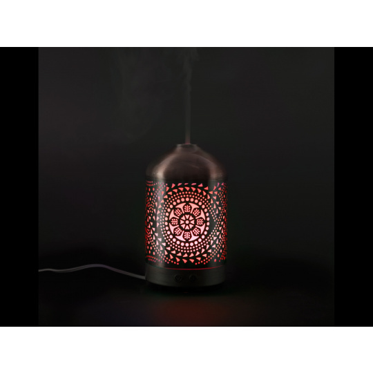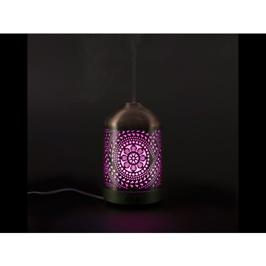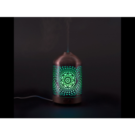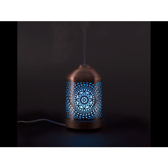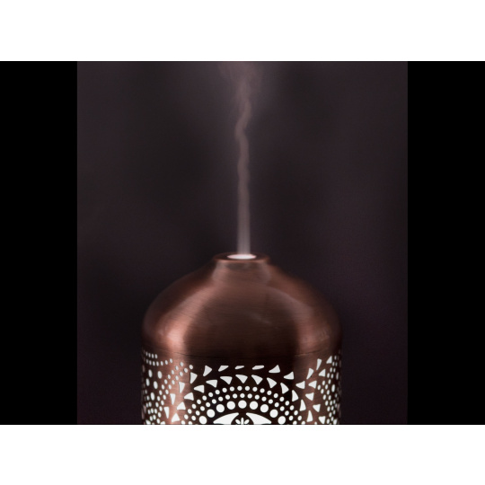 Zvlhčovač vzduchu s difuzérem v designu měděné lampy. Aromatizuje a zvlhčuje vzduch kombinací účinků vodní mlhy a esenciálních olejů. Pomocí jemného ultrasonického vlnění rozkládá esenciální oleje na extrémně malé mikročástice, aniž by je zahříval. Oleje si tak zachovávají původní vůni i léčivé účinky. Aroma difuzér vám pomůže vytvořit z každého pokoje vonící oázu a navodit relaxační atmosféru.Bez přidání esenciálního oleje vám aroma difuzér poslouží jako zvlhčovač vzduchu. Přidáním konkrétního esenciálního oleje můžete sobě, nebo vašim blízkým pomoci s různými obtížemi. Postačí pár kapek kvalitního oleje a můžete ulevit rýmě, kašli, bolestem hlavy, nebo špatnému usínání. Správně zvolený olej vyčistí vzduch, nebo vám jednoduše zpříjemní pobyt v místnosti, ve které se právě nacházíte.Díky stylovému měděnému designu stylově doplní vybavení všech obytných prostor, dětských pokojů, jednacích místností, masážních salónů, wellness center apod. Vhodně zvolenými esenciálními oleji můžete podpořit relaxační atmosféru v ložnici, dezinfekci vzduchu či klidný spánek v dětském pokoji. Koncentraci v pokoji studenta anebo uvolněnou komunikaci, ať už doma nebo v pracovním prostředí.Používejte vždy kvalitní oleje. Použitím levných, umělých olejů sice vytvoříte voňavé prostředí, ale tělo a mysl si neodpočinou. Citlivým osobám může naopak uškodit. Například bolestí hlavy apod.Během provozu aroma difuzéru lze libovolně a jednoduše nastavit světelné efekty, které vytvoří ve vašem pokoji velmi příjemné prostředí a navodí relaxační atmosféru. Aroma difuzér je vhodný všude, kde je z bezpečnostních důvodů nemožné použít otevřený oheň (svíčky v aroma lampách). Kombinuje účinky vodní mlhy a esenciálních olejů.Obsluha aroma difuzéru je velmi jednoduchá. Do zásobníku nalejete vodu, nejlépe destilovanou. Nakapete několik kapek esenciálního oleje a přístroj zapnete stiskem tlačítka MIST (mlha). Aroma difuzér začne okamžitě vytvářet vodní mlhu a rozptylovat olej do vzduchu. Druhým stiskem nastavíte přerušovanou tvorbu mlhy a třetím ho vypnete. Pomocí tlačítka LIGHT můžete nastavit režim barevného podsvícení. Prvním stisknutím nastavíte režim automatické změny barvy. Dalšími stisky můžete nastavit několik barev v intenzivnější nebo světlejší verzi, které zůstanou nastaveny během provozu přístroje, dokud je nezměníte. Nemusíte kontrolovat množství vody v zásobníku. Po vyprázdnění se aroma difuzér sám vypne.