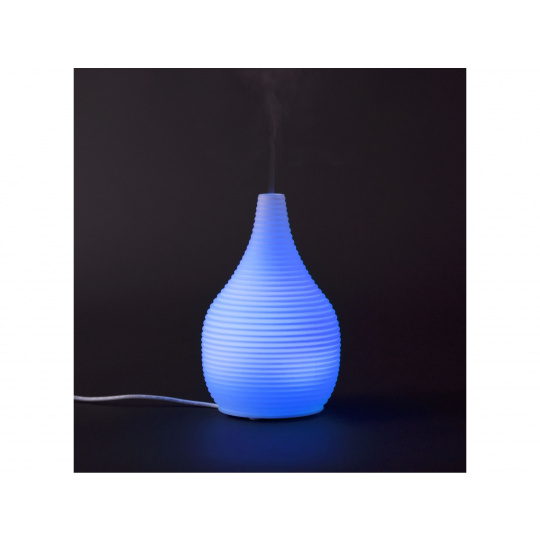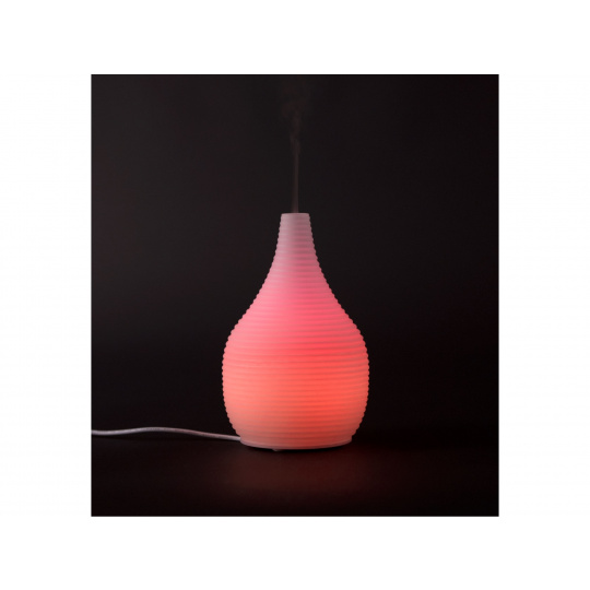 Zvlhčovač vzduchu s difuzérem vyrobený z mléčného skla. Aromatizuje a zvlhčuje vzduch kombinací účinků vodní mlhy a esenciálních olejů. Pomocí jemného ultrasonického vlnění rozkládá esenciální oleje na extrémně malé mikročástice, aniž by je zahříval. Oleje si tak zachovávají původní vůni i léčivé účinky. Aroma difuzér vám pomůže vytvořit z každého pokoje vonící oázu a navodit relaxační atmosféru.Bez přidání esenciálního oleje vám aroma difuzér poslouží jako zvlhčovač vzduchu. Přidáním konkrétního esenciálního oleje můžete sobě, nebo vašim blízkým pomoci s různými obtížemi. Postačí pár kapek kvalitního oleje a můžete ulevit rýmě, kašli, bolestem hlavy, nebo špatnému usínání. Správně zvolený olej vyčistí vzduch, nebo vám jednoduše zpříjemní pobyt v místnosti, ve které se právě nacházíte.Díky neutrálnímu designu z mléčného skla stylově doplní vybavení všech obytných prostor, dětských pokojů, jednacích místností, masážních salónů, wellness center apod. Vhodně zvolenými esenciálními oleji můžete podpořit relaxační atmosféru v ložnici, dezinfekci vzduchu či klidný spánek v dětském pokoji. Koncentraci v pokoji studenta anebo uvolněnou komunikaci, ať už doma nebo v pracovním prostředí.Používejte vždy kvalitní oleje. Použitím levných, umělých olejů sice vytvoříte voňavé prostředí, ale tělo a mysl si neodpočinou. Citlivým osobám může naopak uškodit. Například bolestí hlavy apod.Během provozu aroma difuzéru lze libovolně a jednoduše nastavit světelné efekty, které vytvoří ve vašem pokoji velmi příjemné prostředí a navodí relaxační atmosféru. Aroma difuzér je vhodný všude, kde je z bezpečnostních důvodů nemožné použít otevřený oheň (svíčky v aroma lampách). Kombinuje účinky vodní mlhy a esenciálních olejů.Obsluha aroma difuzéru je velmi jednoduchá. Do zásobníku nalejete vodu, nejlépe destilovanou. Nakapete několik kapek esenciálního oleje a přístroj zapnete stiskem tlačítka. Aroma difuzér začne okamžitě vytvářet vodní mlhu a rozptylovat olej do vzduchu. Dalšími stisky můžete nastavit různé barvy v intenzivnější nebo světlejší verzi, které zůstanou nastaveny během provozu přístroje, dokud je nezměníte. Barevné světlo procházející mléčným sklem vytváří příjemný světelný efekt. Nemusíte kontrolovat množství vody v zásobníku. Po vyprázdnění se aroma difuzér sám vypne.