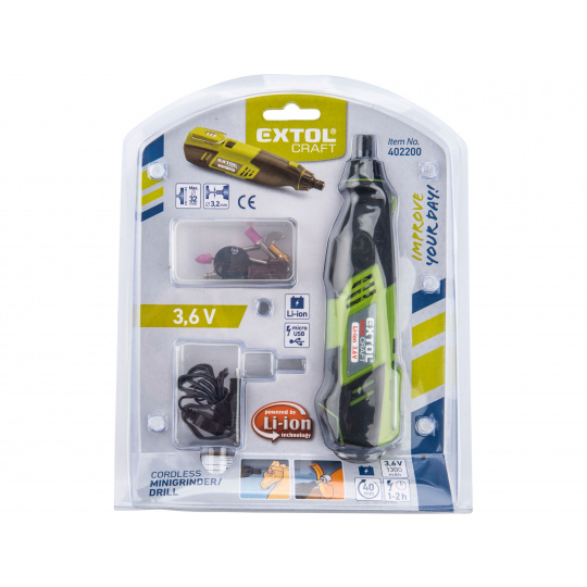 Aku minibruska je určena k jemnému broušení, odhrotování, frézování, gravírování, leštění a k jemnému vrtání otvorů. Nízká hmotnost, bateriový pohon, malé rozměry, ergonomicky tvarované tělo a gumové úchopové části umožňují příjemné držení a snadnou manipulaci při práci. Díky novému USB konektoru je možné brusku nabíjet z běžné USB nabíječky, počítače nebo powerbanky a díky tomu lze neomezeně používat i v místech kde není proud. Li-ion akumulátor umožňuje aku brusku kdykoliv dobíjet, aniž by se tím snižovala kapacita akumulátoru. Li-ion akumulátor ztrácí energii vlivem samovybíjení velmi pomalu a vydrží dlouho nabitý.