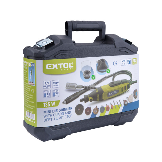 Malá bruska s řadou nástavců, určená k jemným gravírovacím pracím, preciznímu opracování dřeva, kovu či plastů a práci ve stísněných prostorech. Má ergonomický tvar a je pokrytá gumou v místech úchopu, což snižuje únavu při práci. Stroj umožňuje výměnu a montáž upínacích kleštin pro uchycení nástrojů s průměrem stopky 3 nebo 3,2 mm. Součástí balení je sada 210 kusů brusných a řezacích nástrojů a nástavců. Pro velmi jemnou a drobnou práci je u brusky ohebný nástavec.