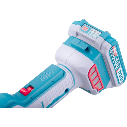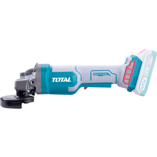 Nový typ úhlové brusky Total s ergonomickou rukojetí a přídavnou rukojetí. Bruska má volbu pro rychlé nebo nízké otáčky. Je součástí řady P20S, kde na jednu baterii máte možnost provozovat až 360strojů.Tato akumulátorová úhlová bruska s bezuhlíkovým motorem je určena k broušení, smirkování a řezání kovových materiálů a kamene bez použití vody s použitím k tomu určeného nástroje pro úhlové brusky. • Nepřítomnost napájecího kabelu poskytuje svobodu a komfort při práci a manipulaci s nářadím. Nářadí lze tak s výhodou použít pro práci v místech, kde není možné použít elektrické nářadí s napájecím kabelem z důvodu nedostupnosti distribuční elektrické sítě.Toto nářadí je vybaveno systémem ochrany nářadí a akumulátoru, který v případě hrozícího přetížení nebo přehřátí automaticky odpojí napájení motoru. Systém tak chrání životnost nářadí i akumulátoru.