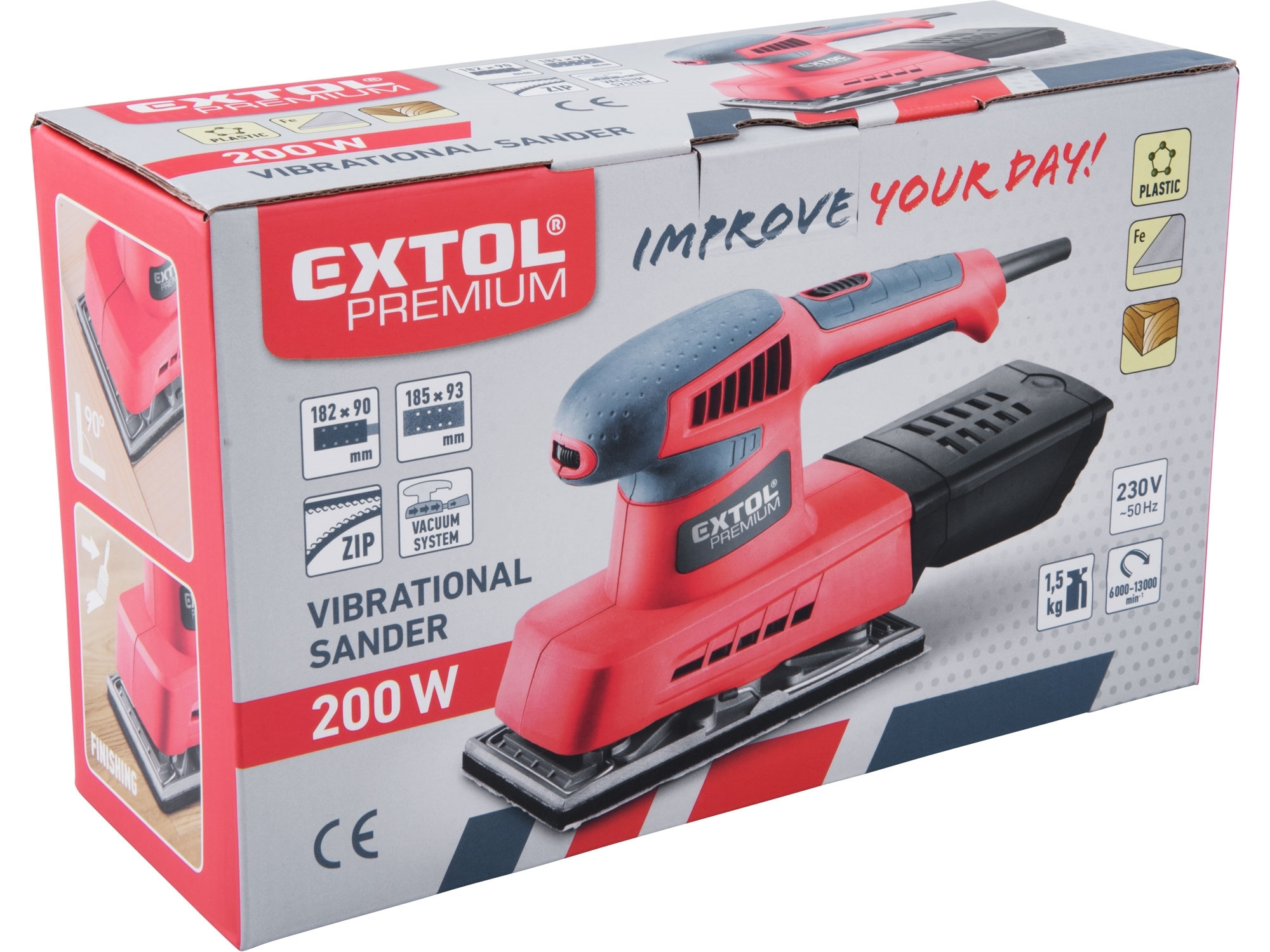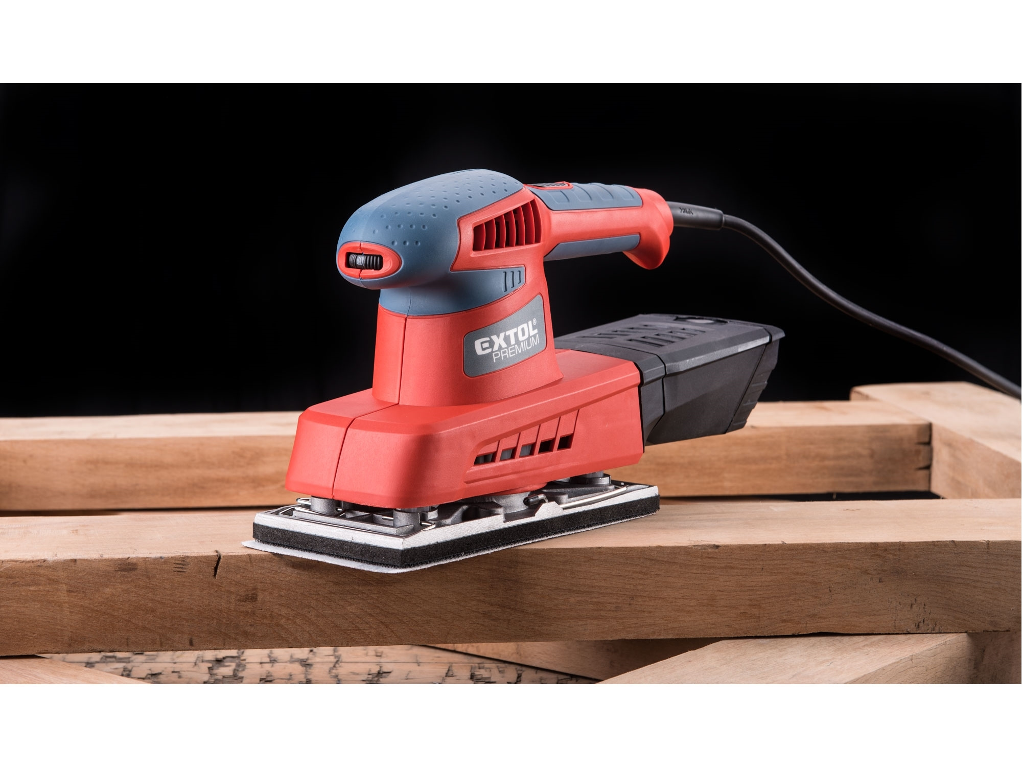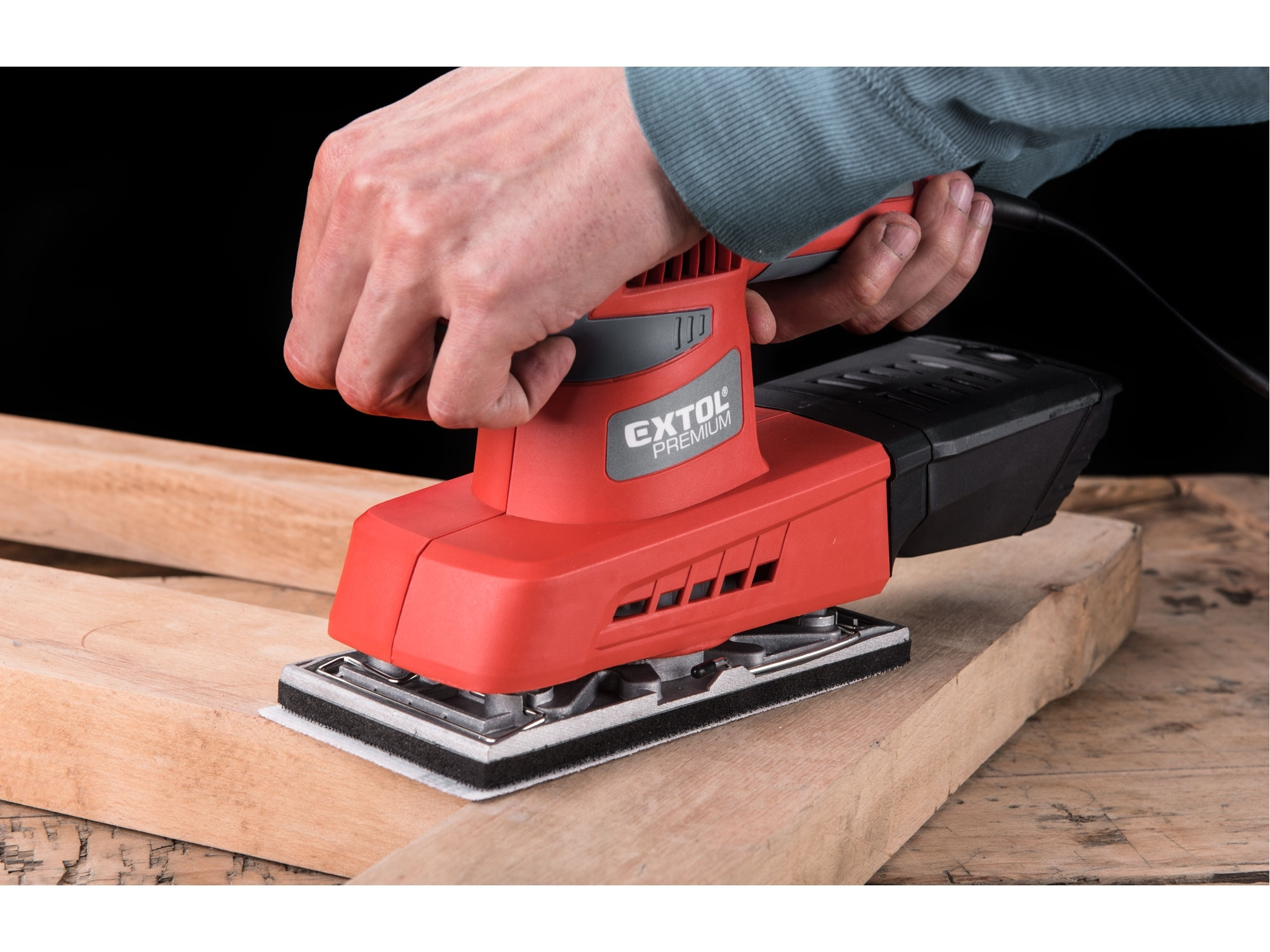 Dvouruční výkonná bruska pro plošné a rohové broušení plochých dřevěných materiálů, kovů, plastů, tmelů a laků. Při broušení si můžete upravit rychlost dle typu broušeného materiálu. Z důvodu delší životnosti má bruska pevnou kovovou základnu na kterou lze přichytit brusné papíry pomocí suchého zipu nebo svorkami. Čistý pracovní prostor zajišťuje integrovaný systém odsávání pilin do sběrného boxu. Horní strana rukojeti je pokryta gumou, která tlumí přenos vibrací při práci.Není vhodná pro broušení sádrokartonu.