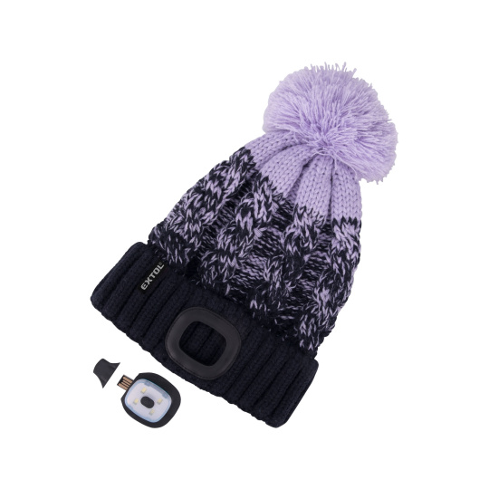čepice s čelovkou 4x45lm, USB nabíjení, tmavě modrá/fialová s bambulí, univerzální velikost, 100% acryl