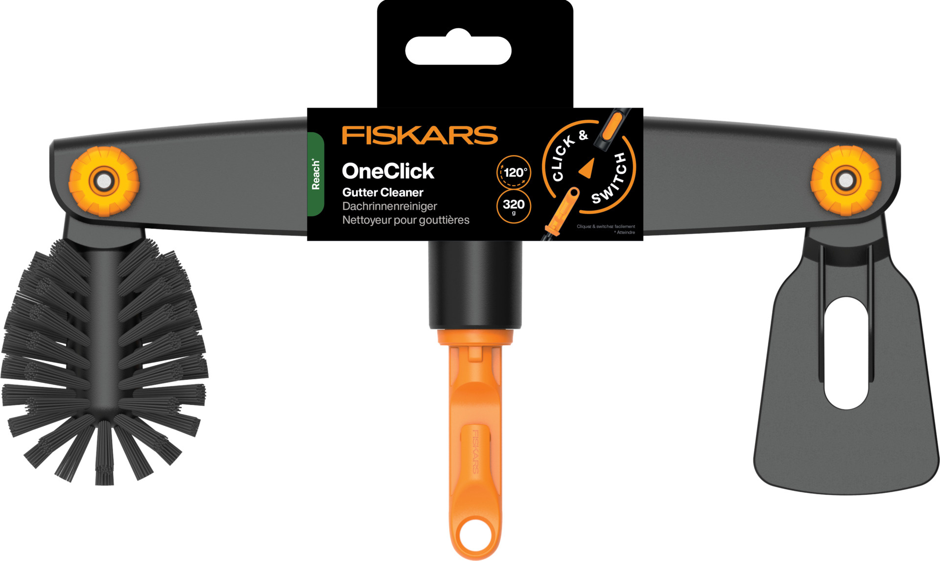 Čistič okapů Fiskars OneClick je navržený pro efektivní údržbu střešních žlabů přímo ze země. Kombinuje v sobě škrabku pro odstranění hrubých a usazených nečistot a zaoblený kartáč pro finální dočištění. Díky nastavitelnému úhlu pracovní hlavy a teleskopické násadě OneClick vyčistíte okapy rychle a bez rizika spojeného s prací na žebříku.