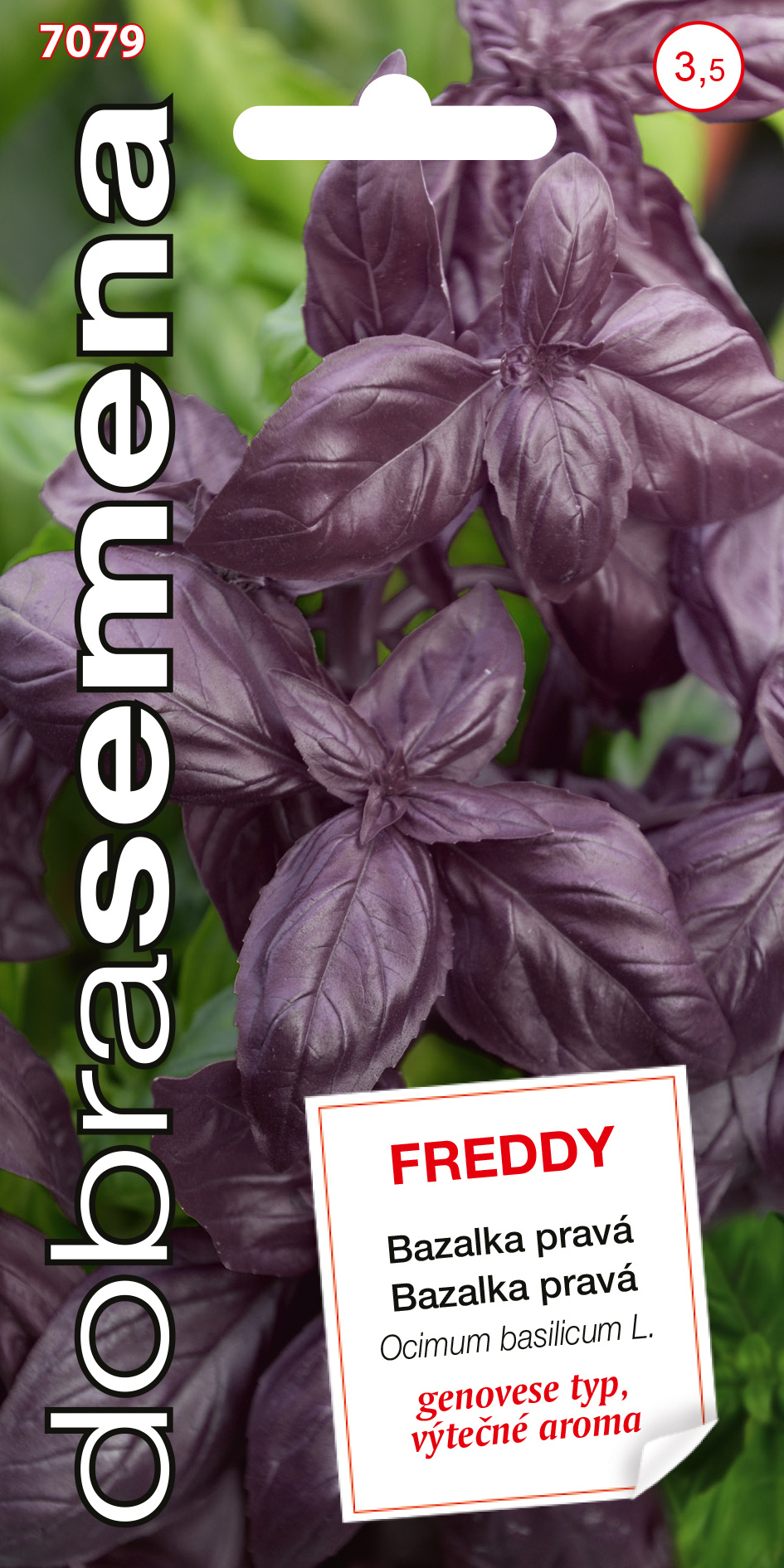 FREDDY - Výjimečná odrůda s červeným listem typu genovese, aromatická i barevně výrazná v letních salátech. Pevná a dobře větvená rostlina dorůstá výšky 45 cm. Má výborný zdravotní stav.