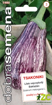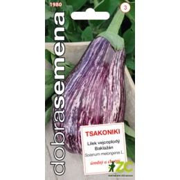 TSAKONIKI - tradiční řecká odrůda lilku s kyjovitými plody. Slupka je fialově bílá, žíhaná a velice dekorativní. Dužina je bělavá a kompaktní.  Plody sklízejte plně vybarvené, ale nepřezrálé, tehdy jsou křehké a nejchutnější.