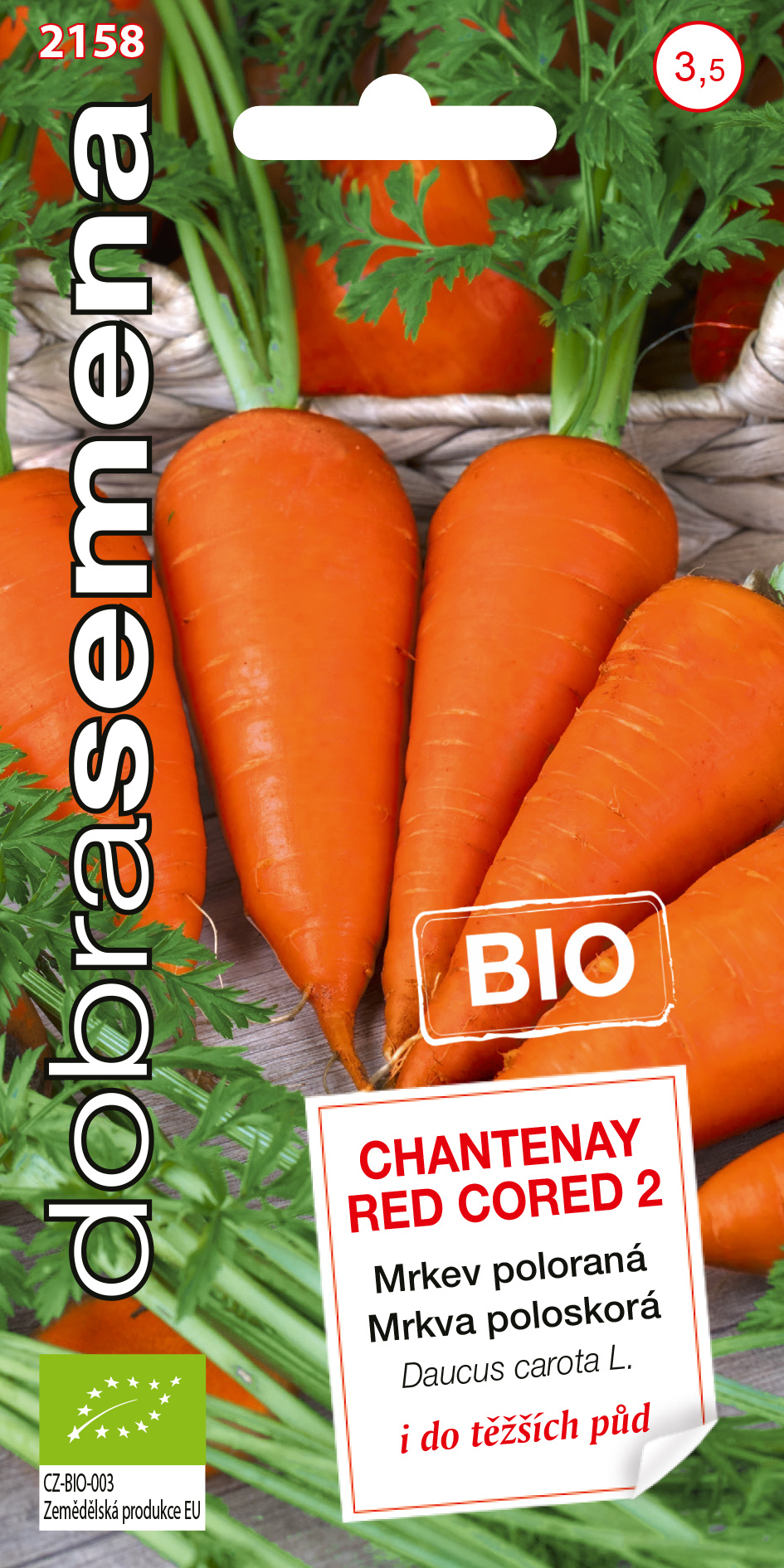 CHANTENAY RED CORED 2 - tradiční osvědčená odrůda s kratšími, kónickými kořeny a sytě oranžovým vybarvením. Středně raná mrkev, díky kratším kořenům je vhodná i do těžších půd. Semena pochází z BIO produkce, byla pěstována na certifikovaných plochách s dodržením veškerých požadavků kladených na BIO osiva. .