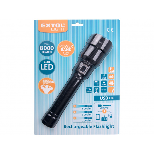 svítilna 8000lm, zoom, USB nabíjení s powerbankou, 60W COB LED