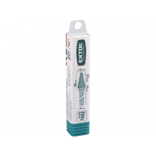 průměr frézy 12mm, délka ostří 28mm, průměr stopky 6mm, celková délka 73mm, materiál wolfram karbid, tvrdost 89-91HRA