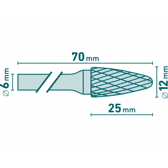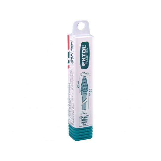průměr frézy 12mm, délka ostří 25mm, průměr stopky 6mm, celková délka 70mm, materiál wolfram karbid, tvrdost 89-91HRA