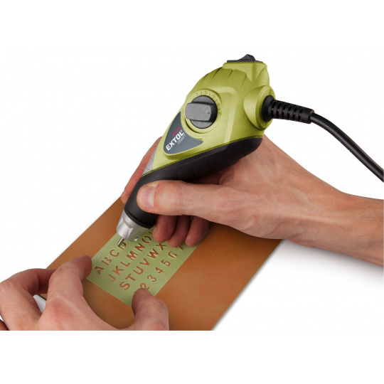 kadence úderů 6000/min, gravírovací hrot - karbid wolframu, pro materiály do tvrdosti 58 HRC (dřevo, sklo, plast, měkké kovy, ocel atd.), el. regulace hloubky - ano