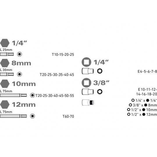 hroty 1/4"x25mm: T10-15-20-25, hroty 8mm(5/16")x30mm: T20-25-30-35-40-45, hroty 10x75mm: T20-25-30-40-45-50-55, hroty 12x75mm: T60-70