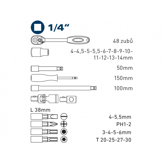hlavice nástrčné a zástrčné, sada 31ks, 1/4"