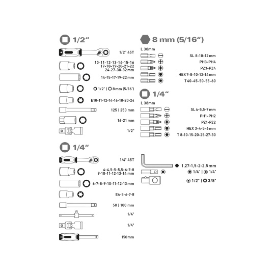 1/4": 4-4,5-5-5,5-6-7-8-9-10-11-12-13-14mm, E4-5-6-7-8; 1/2": 10-11-12-13-14-15-16-17-18-19-20-21-22-23-24-27-30-32mm, E10-11-12-14-16-18-20-24