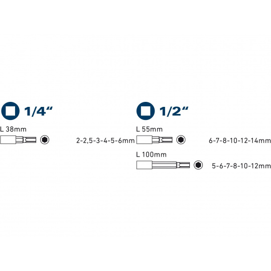 1/4": HEX2-2,5-3-4-5-6mm, 1/2": 6-7-8-10-12-14mm