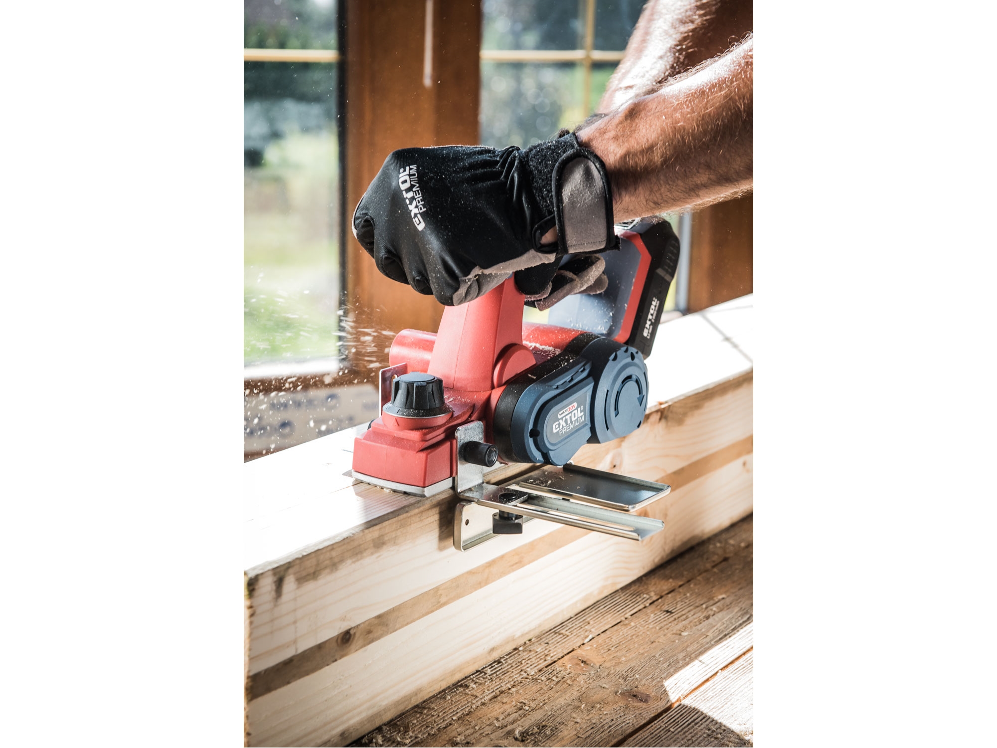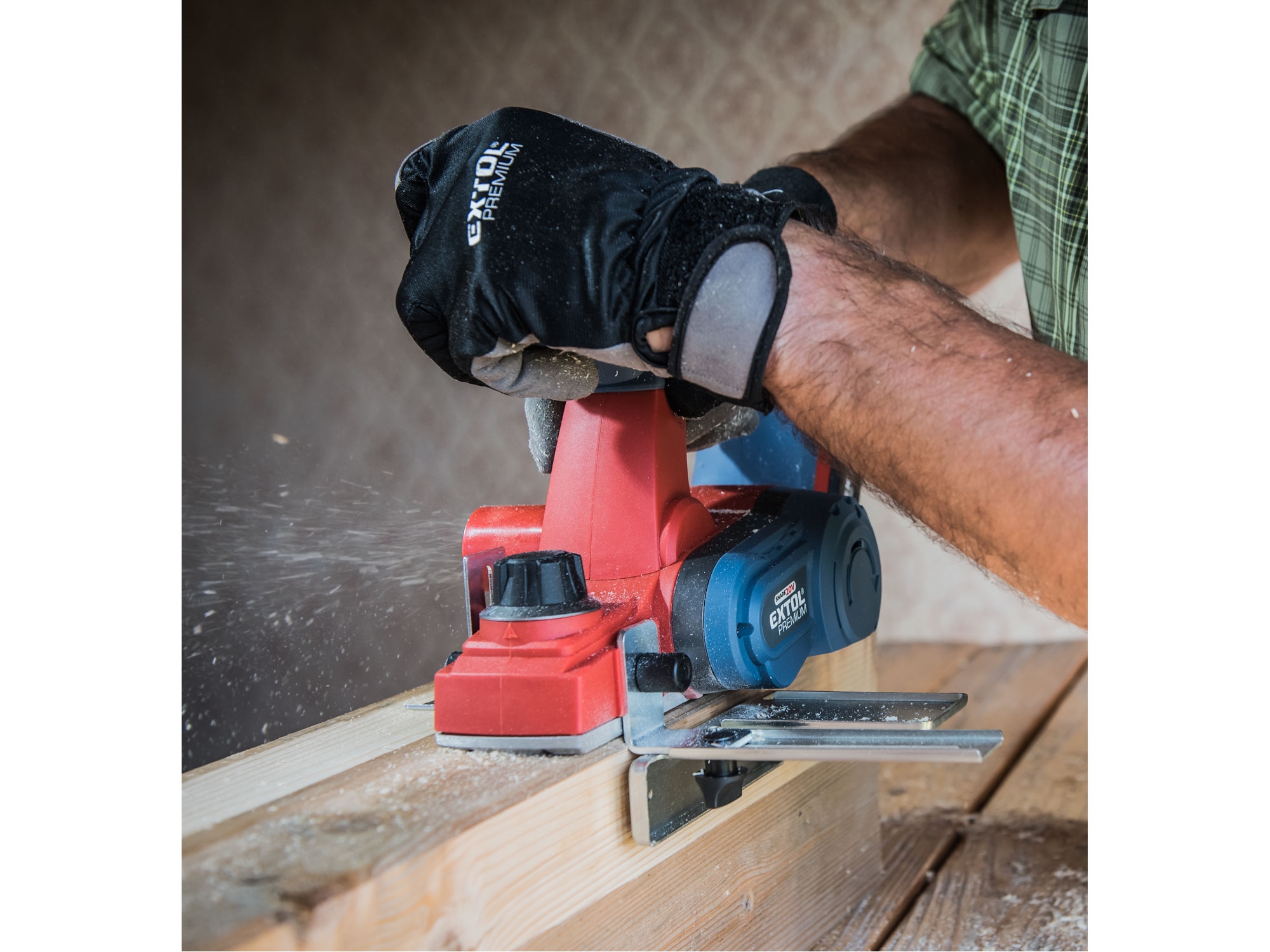 Aku hoblík Extol Premium kombinuje rychlost a výkonnost elektrického hoblíku s pohodlím akumulátorového nářadí. Výsledkem je rychlé a přesné odebrání materiálu bez překážejícího kabelu. Řezná hlava hoblíku má dva kvalitní břity. Ochranný trn v pracovní desce hoblíku chrání čepel i obráběný materiál tím, že udržuje čepel zvednutou a mimo kontakt s povrchem vašeho materiálu mezi řezy. Sběrný vak připojený na prachový výstup pomáhá udržovat pracovní prostor čistý a bez pilin. Přiložený adaptér pro falcování pomáhá vytvářet polodrážky ve vašich deskách a paralelní adaptér udržuje hoblík v nastavené vzdálenosti. Pro běžnou práci dostačují jeden nebo dva 2000mAh akumulátory, které můžete rychle nabít v rychlonabíječce, pro náročnější nebo delší práci doporučujeme větší akumulátory s kapacitou 4000–8000mAh. Akumulátor lze použít ve všech typech nářadí řady EXTOL SHARE20V. Díky použité Li-ion technologii je ho možné kdykoliv dobíjet, aniž by se tím snižovala jeho kapacita. Li-ion akumulátor ztrácí energii vlivem samovybíjení velmi pomalu a vydrží dlouho nabitý a připravený k použití.