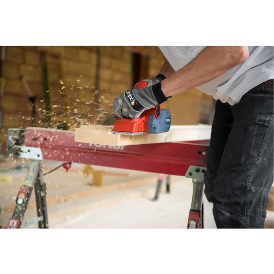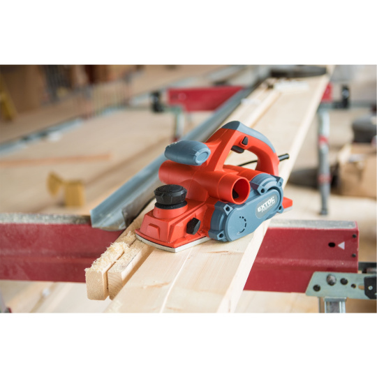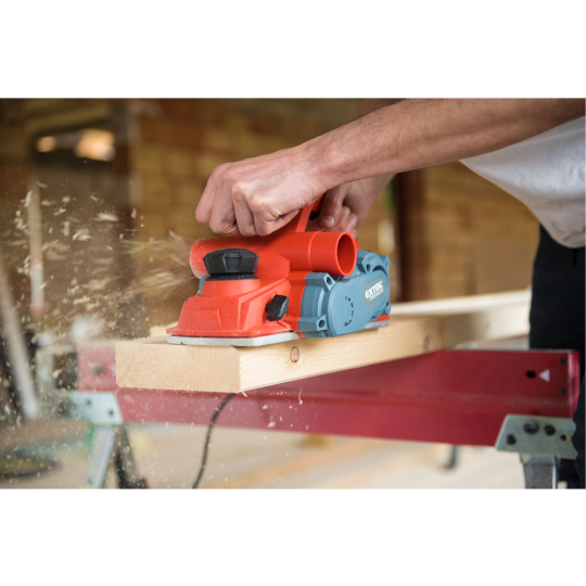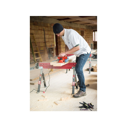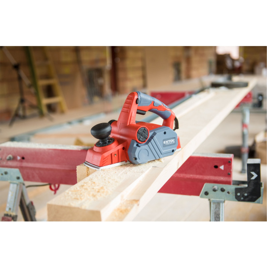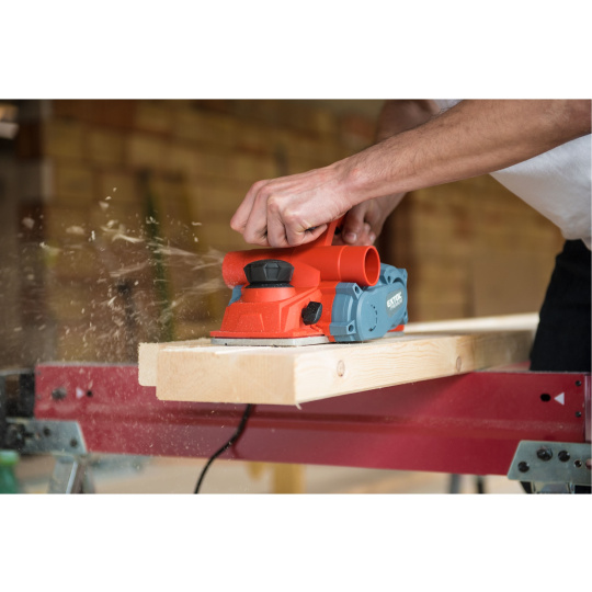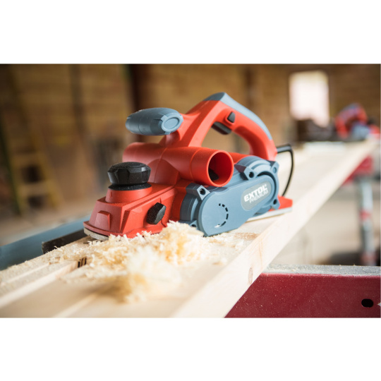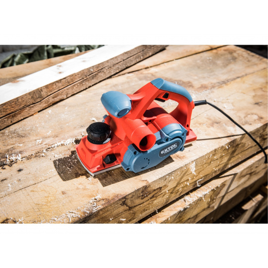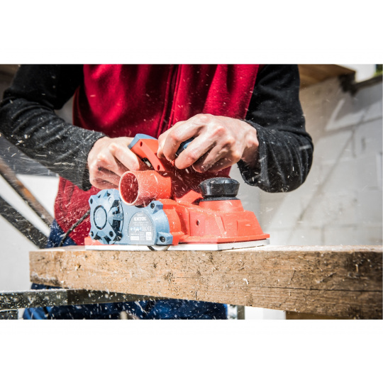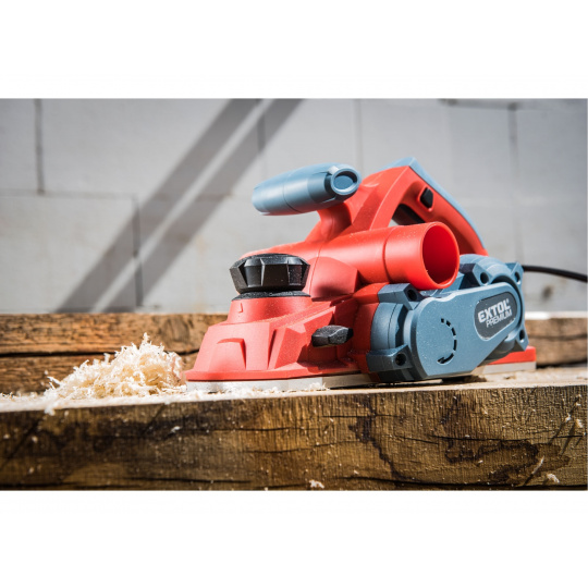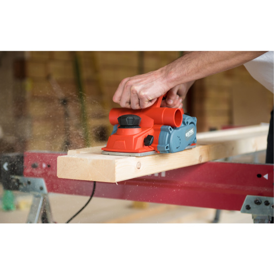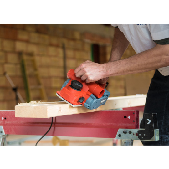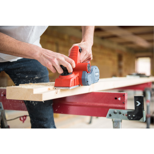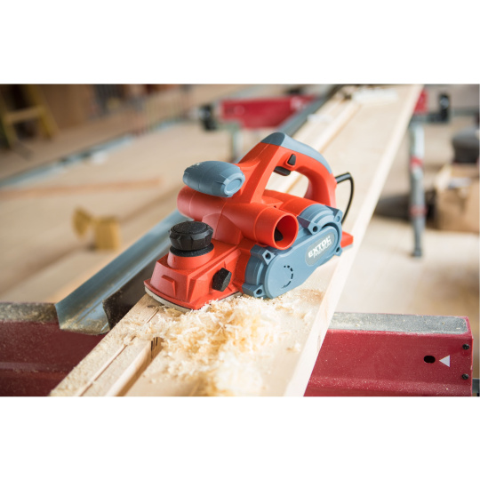 Velmi silný hoblík s hoblovací šířkou 110mm je určen k hoblování, srážení a drážkování dřeva, např. trámů a prken. Můžete s ním hoblovat 0-3mm při jednom protahu a hloubka úběru se nastavuje po 0,25mm. Při hoblování polodrážek můžete využít rozsah 0 až 8mm. Na hoblovací desce jsou dvě různě hluboké drážky sloužící k jednoduchému srážení hran a sklopný ochranný trn, který chrání při přerušení práce, nože a plochu pod hoblíkem proti poškození. Pokud preferujete práci bez tohoto ochranného trnu, můžete ho jednoduše zajistit v desce, aby se nevyklápěl. Pro udržování čistého pracovního prostoru lze k hoblíku připojit odsávání z pravé nebo levé strany.