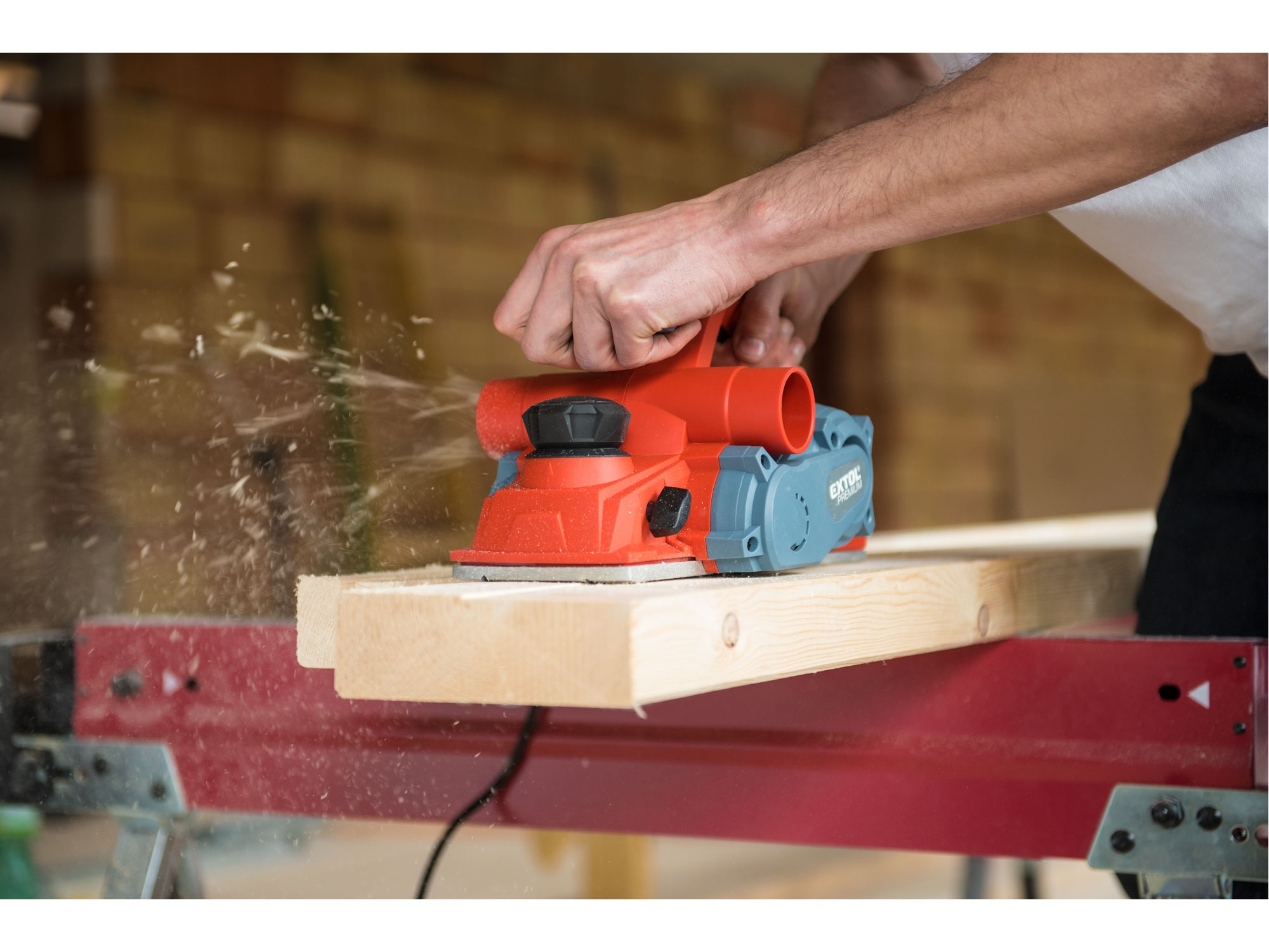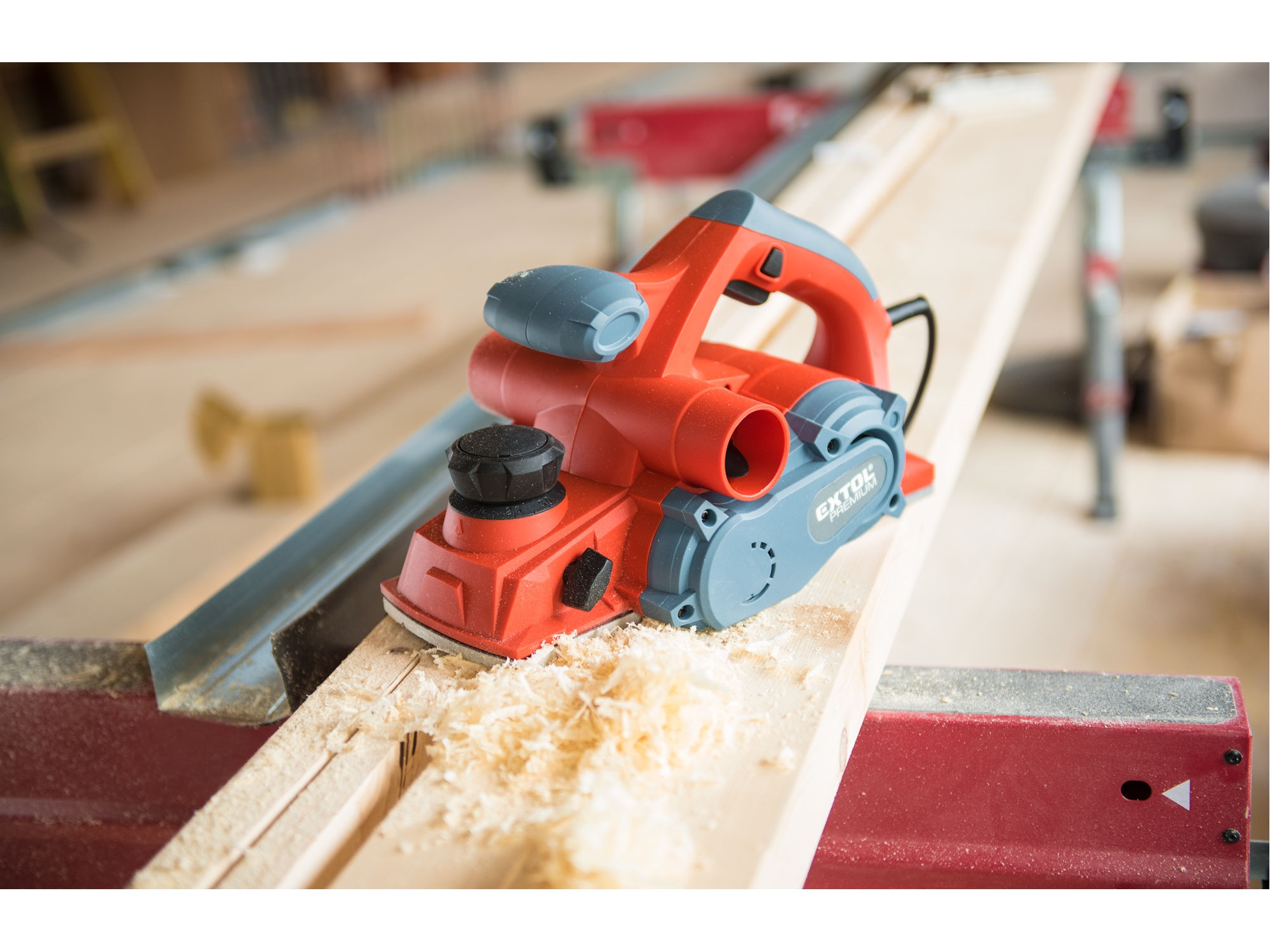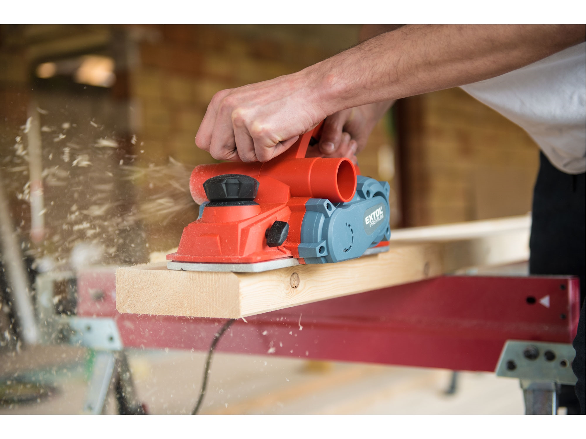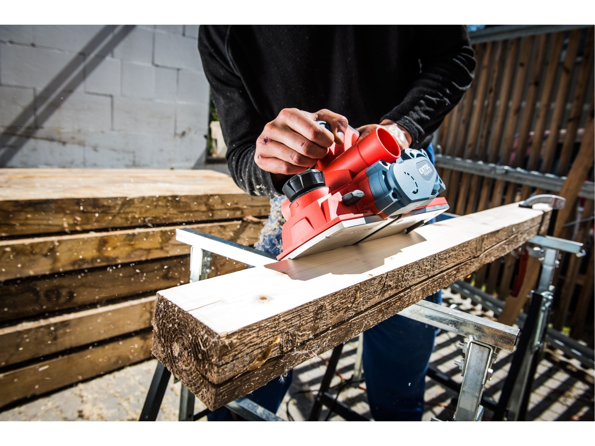 Velmi silný hoblík s hoblovací šířkou 110mm je určen k hoblování, srážení a drážkování dřeva, např. trámů a prken. Můžete s ním hoblovat 0-3mm při jednom protahu a hloubka úběru se nastavuje po 0,25mm. Při hoblování polodrážek můžete využít rozsah 0 až 8mm. Na hoblovací desce jsou dvě různě hluboké drážky sloužící k jednoduchému srážení hran a sklopný ochranný trn, který chrání při přerušení práce, nože a plochu pod hoblíkem proti poškození. Pokud preferujete práci bez tohoto ochranného trnu, můžete ho jednoduše zajistit v desce, aby se nevyklápěl. Pro udržování čistého pracovního prostoru lze k hoblíku připojit odsávání z pravé nebo levé strany.