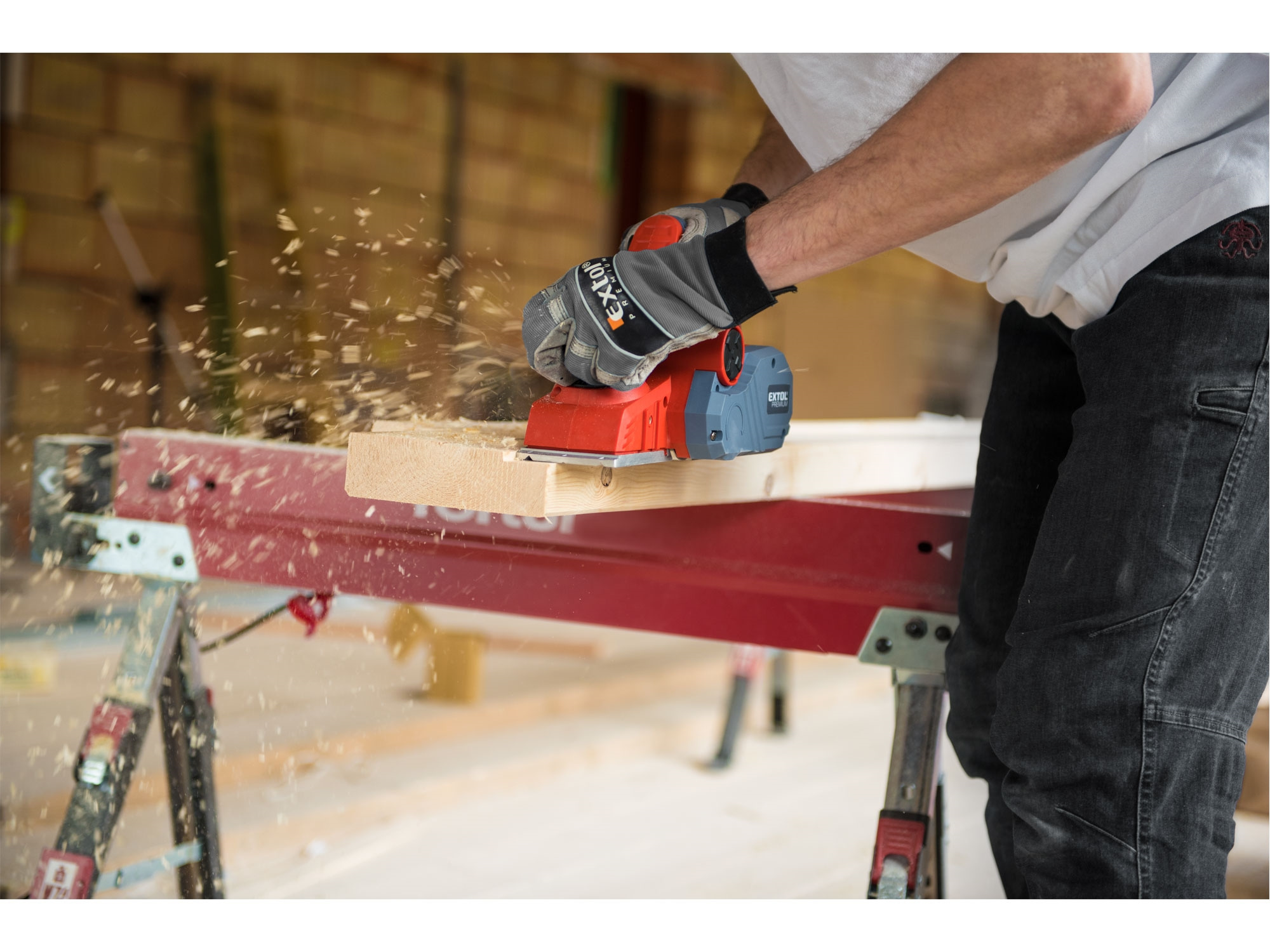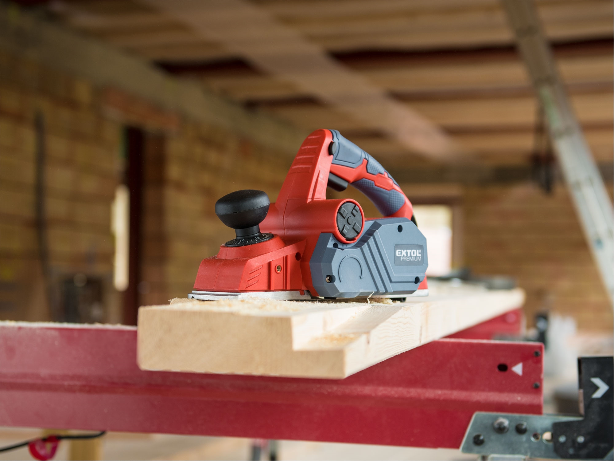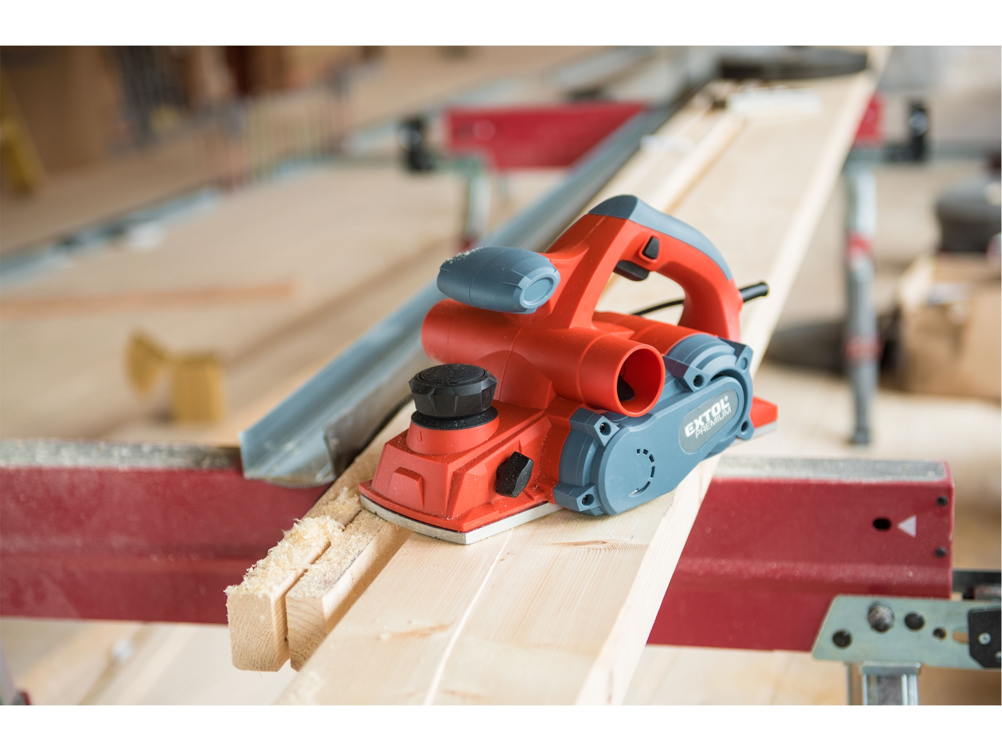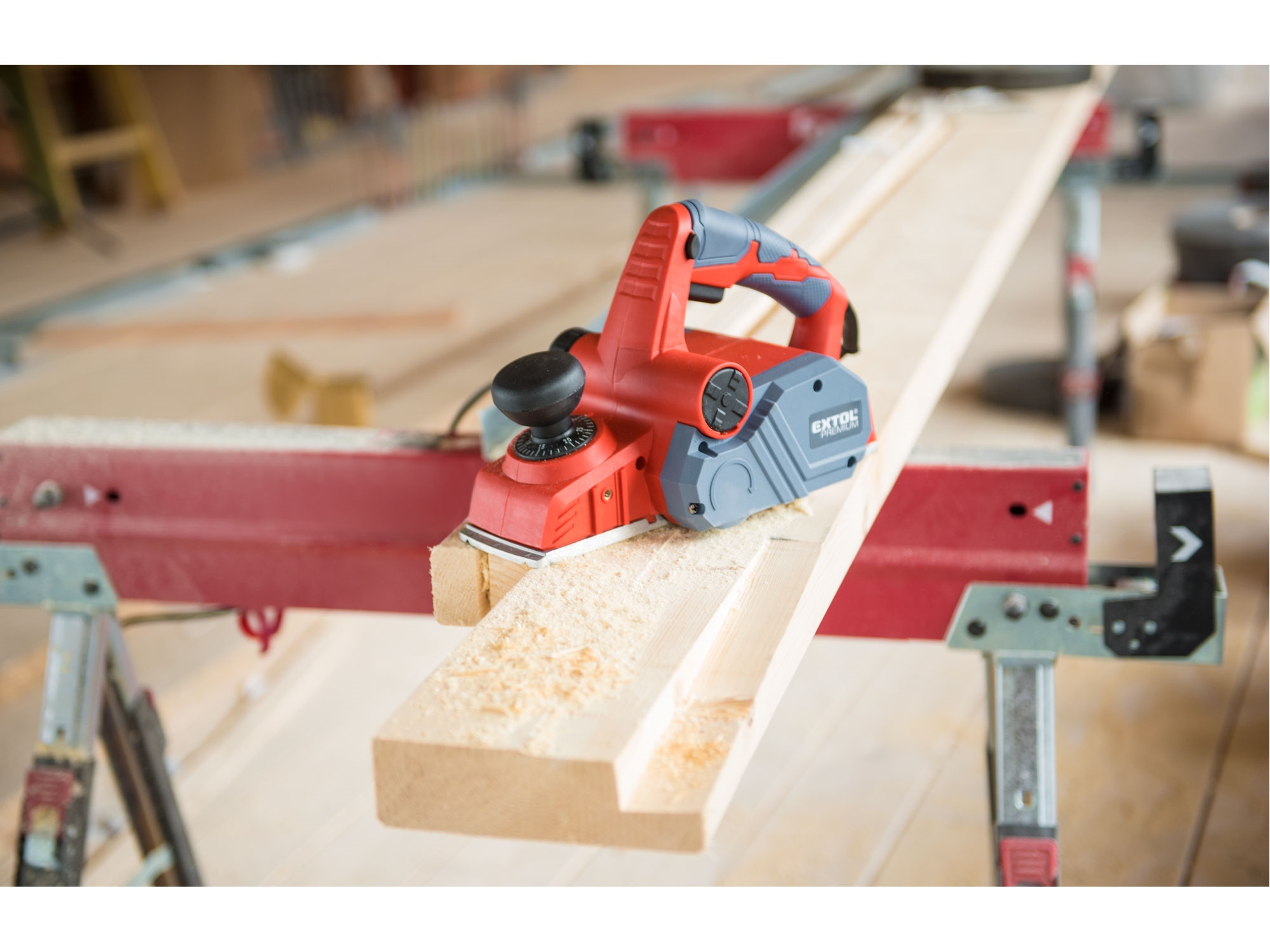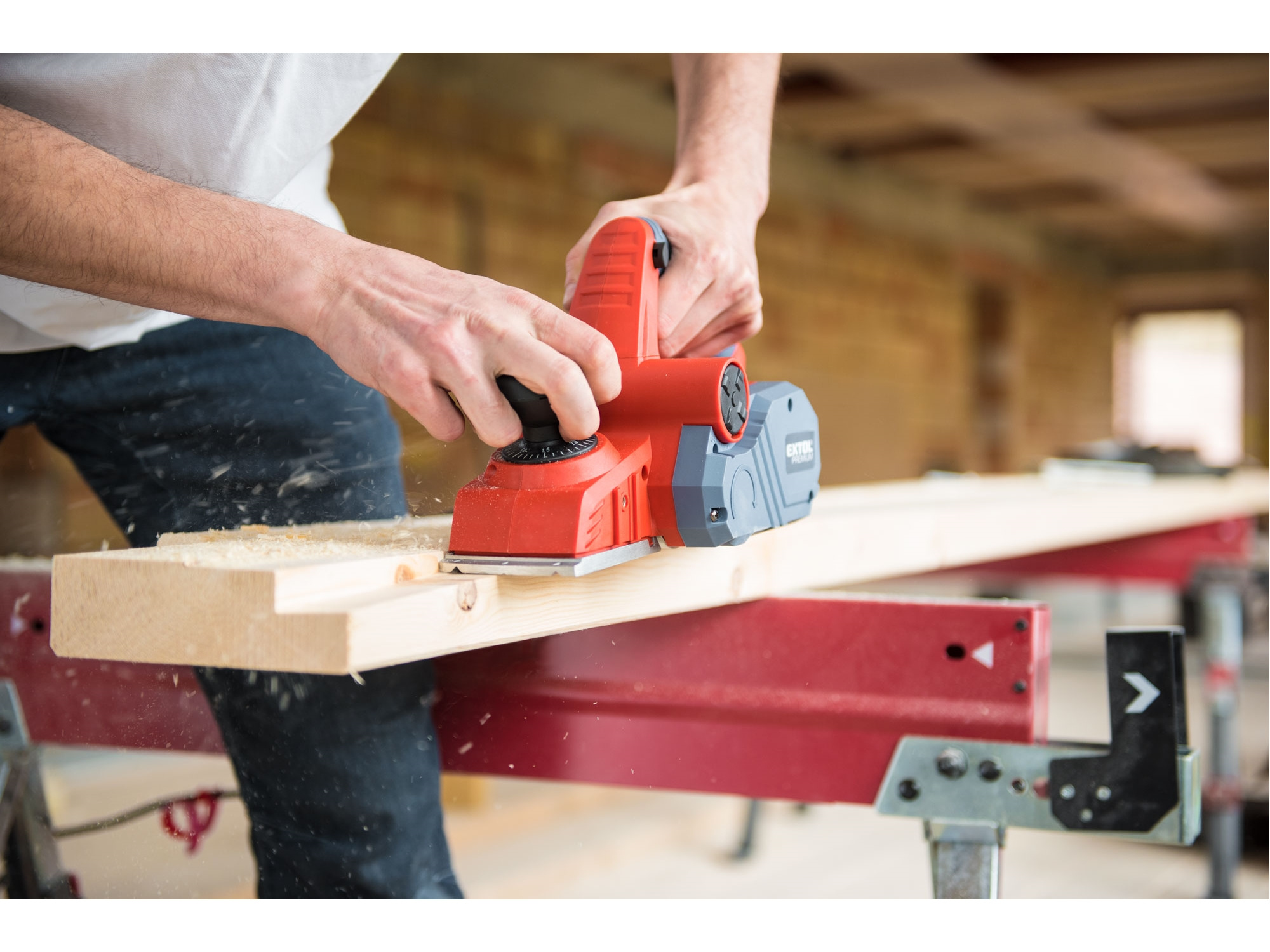 Velmi silný hoblík s hoblovací šířkou 110mm je určen k hoblování, srážení a drážkování dřeva, např. trámů a prken. Můžete s ním hoblovat 0-3mm při jednom protahu a hloubka úběru se nastavuje po 0,25mm. Při hoblování polodrážek můžete využít rozsah 0 až 8mm. Na hoblovací desce jsou dvě různě hluboké drážky sloužící k jednoduchému srážení hran a sklopný ochranný trn, který chrání při přerušení práce, nože a plochu pod hoblíkem proti poškození. Pokud preferujete práci bez tohoto ochranného trnu, můžete ho jednoduše zajistit v desce, aby se nevyklápěl. Pro udržování čistého pracovního prostoru lze k hoblíku připojit odsávání z pravé nebo levé strany.