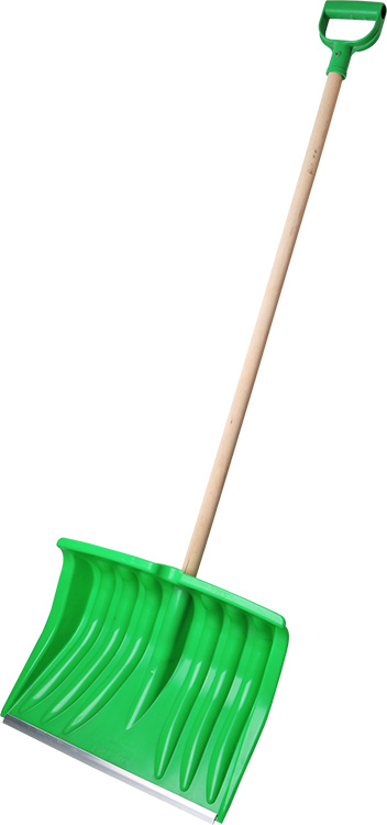 Plastové hrablo na sníh s hliníkovou lištou a dřevěnou násadou.
