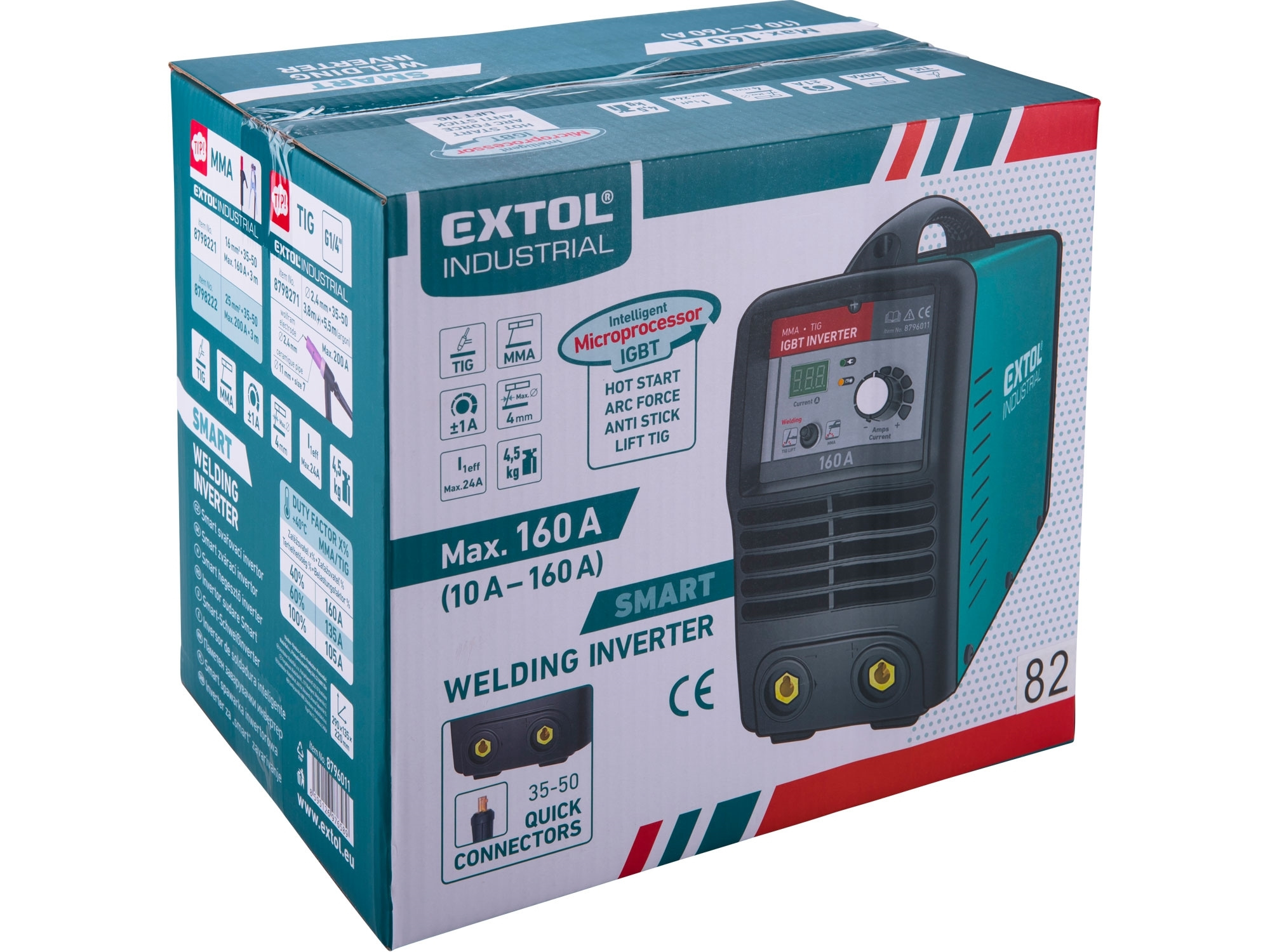 Profesionální svařovací smart invertory Extol® Industrial s počítačovým řízením jsou svařovací přístroje třetí generace pro MMA a TIG metodu svařování, v nichž je použita nejmodernější mikroprocesorová IGBT technologie. Invertory jsou vybaveny přehledným ovládacím panelem s displejem se zobrazenou nastavenou hodnotou svařovacího proudu a jsou velmi snadno ovladatelné. Díky sofistikované elektronice lze velmi jemně nastavit svářecí proud s přesností na jednotky. Svařovací invertory je také možno používat se speciálním svařovacím kabelem vybaveným hadicí pro připojení ke zdroji ochranného plynu argonu a TIG hořákem s wolframovou elektrodou. Tato metoda je velice efektivní pro svařování nerezové oceli a ocelí především, litiny, dále mědi, titanu a niklu. TIG svařovací kabely lze k invertorům dokoupit. Invertory jsou dodávány bez svařovacích kabelů. funkce: HOT START - usnadňuje zapálení oblouku tím, že dojde k počátečnímu automatickému navýšení zapalovacího proudu oproti původně nastavené hodnotě svářecího proudu ARC FORCE - stabilizace zapáleného svařovacího oblouku v průběhu sváření v závislosti na délce svařovacího oblouku. Pokud se elektroda lepí při zkrácení oblouku, invertor zvýší proud. V případě dlouhého oblouku invertor sníží proud, čímž se vytvoří čas na přiblížení elektrody k materiálu, aniž by oblouk zhasnul ANTI STICK - automatické snížení svařovacího proudu na minimum (cca 10A), pokud by došlo k přilepení elektrody, čímž elektroda zchladne a lze ji pak snadno odtrhnout LIFT TIG (při nastavení svařovací metody TIG) - pro zapálení elektrického oblouku oddálením wolframové elektrody od povrchu svařovaného dílu. Tento způsob výrazně přispívá k elektromagnetické kompatibilitě a snižuje na minimum výskyt wolframových vměstků a opotřebení elektrody.