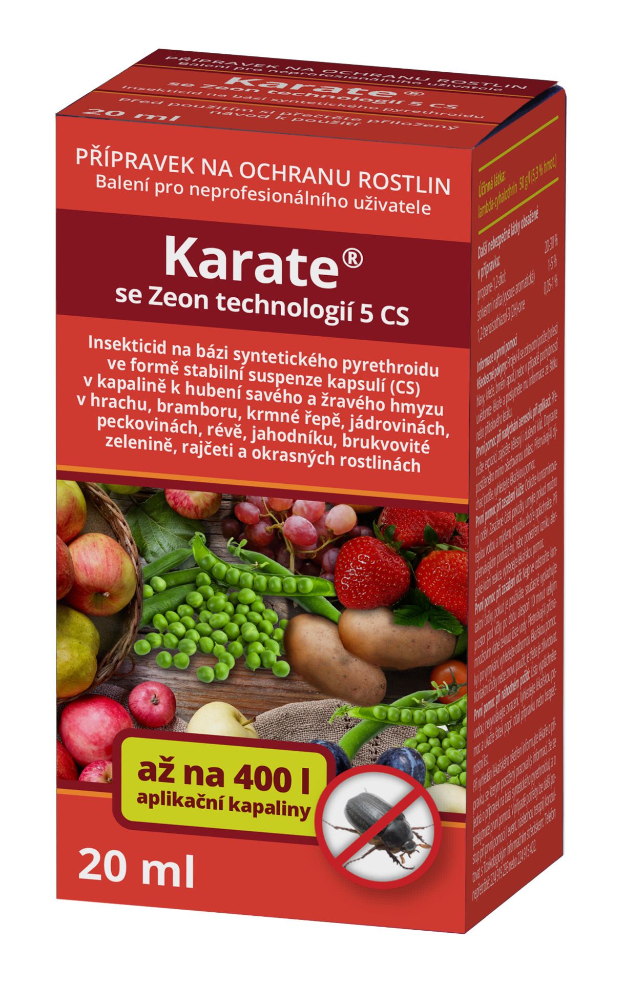 Karate je postřikový insekticidní přípravek ve formě syntetického pyrethroidu ve formě stabilní suspenze kapsulí v kapalině k hubení savého a žravého hmyzu v obilninách, hrachu, bobu, řepce olejce, hořčici bílé, bramboru, kukuřici na zrno, cukrovce, řepě krmné, vojtěšce, jeteli, jádrovinách, peckovinách, révě, lnu, jahodníku, čočce, brukvovité zelenině, rajčeti, okurce, paprice, česneku, mrkvi, petrželi, pastiňáku setém, fenyklu řapíkovém, kopru vonném, kmínu kořenném, okrasných rostlinách, lesních porostech a skladištních škůdců v prázdných skladech, silech a provozech.