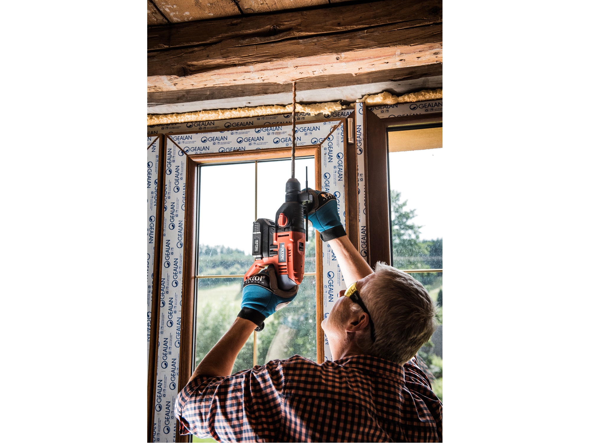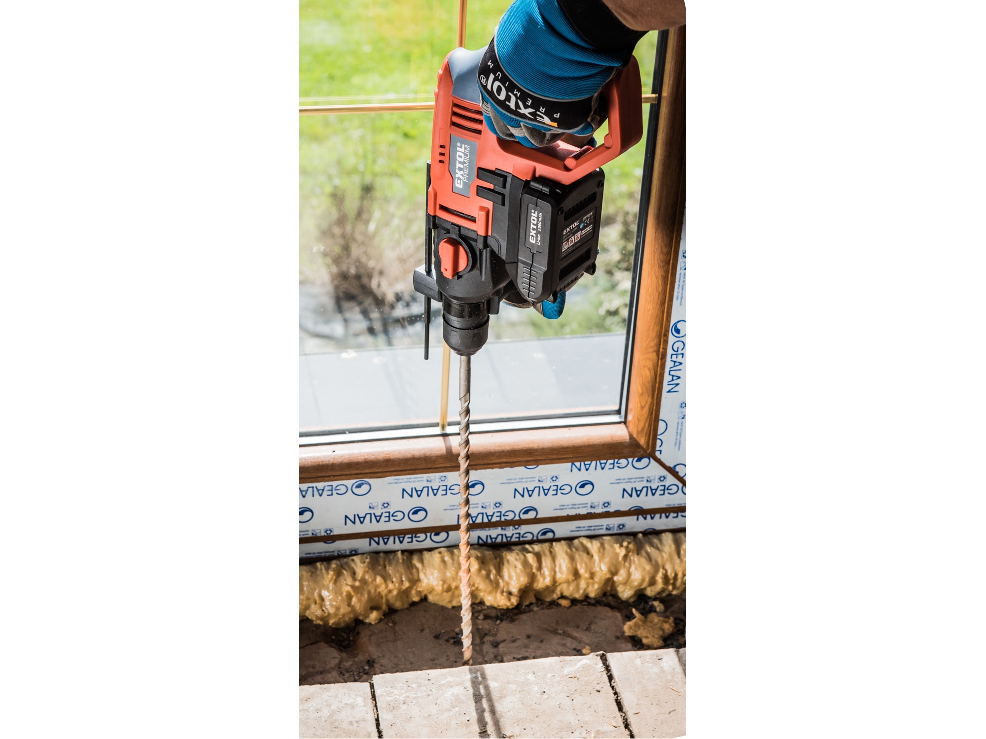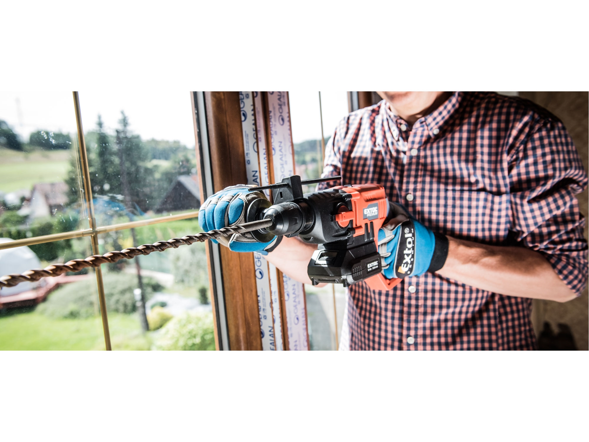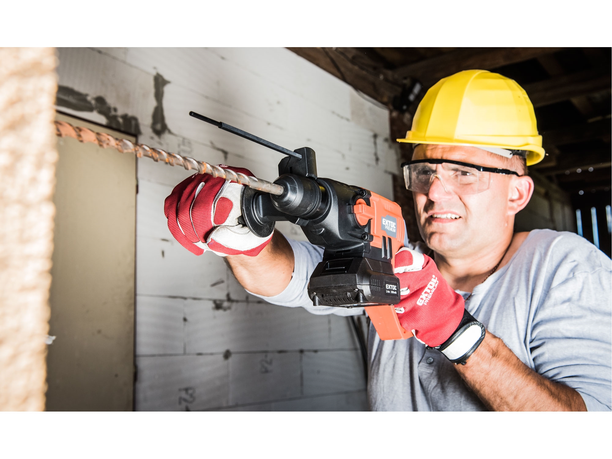 Aku vrtací kladivo je určeno k rychlému vrtání do cihel a betonu pomocí vrtáků s SDS Plus stopkou. Díky pneumatickému příklepovému systému je schopno vrtat mnohem rychleji a efektivněji než příklepové vrtačky. Jeho hlavní výhodou je akumulátorový pohon, který dovoluje si vzít kladivo s sebou tam kde s ním potřebujete pracovat, bez ohledu na to, jestli tam je rozvod elektrické energie. Kladivo je vybaveno zpětným chodem pro snadné vytažení zaseklého vrtáku a dvěma rozsahy rychlosti, které lze využít dle vrtaného materiálu. Pro běžnou práci dostačují jeden nebo dva 2000mAh akumulátory, které můžete rychle nabít v rychlonabíječce, pro náročnější nebo delší práci doporučujeme větší akumulátory s kapacitou 4000–8000mAh. Akumulátor lze použít ve všech typech nářadí řady EXTOL SHARE20V. Díky použité Li-ion technologii je ho možné kdykoliv dobíjet, aniž by se tím snižovala jeho kapacita. Li-ion akumulátor ztrácí energii vlivem samovybíjení velmi pomalu a vydrží dlouho nabitý a připravený k použití.