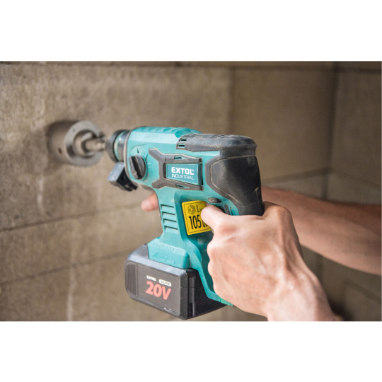 Aku vrtací kladivo je určeno k rychlému vrtání do cihel a betonu pomocí vrtáků s SDS plus stopkou a menším sekacím pracem. Kladivo je poháněno nejmodernějším „brushless" motorem. Tento nový typ motoru má vyšší životnost, je výkonnější a má menší spotřebu el. energie než klasické motory s uhlíkovými kartáči. Díky pneumatickému příklepovému systému je schopno vrtat mnohem rychleji a efektivněji než příklepové vrtačky. Kladivo má zámek sekáče, takže si můžete před sekáním sekáč nastavit do patřičné polohy a při sekání bude kladivo udržovat sekáč v této poloze. Jeho hlavní výhodou je akumulátorový pohon, který dovoluje si vzít kladivo s sebou tam kde s ním potřebujete pracovat, bez ohledu na to, jestli tam je rozvod elektrické energie. Kladivo je vybaveno zpětným chodem pro snadné vytažení zaseklého vrtáku a regulací rychlosti, kterou lze využít dle vrtaného materiálu. Integrované LED osvětlení má zpožděné vypnutí a svítí ještě několik vteřin po vypnutí kladiva. Pro běžnou práci dostačují jeden nebo dva 2000mAh akumulátory, které můžete rychle nabít v rychlonabíječce, pro náročnější nebo delší práci doporučujeme větší akumulátory s kapacitou 4000–8000mAh. Akumulátor lze použít ve všech typech nářadí řady EXTOL SHARE20V. Díky použité Li-ion technologii je ho možné kdykoliv dobíjet, aniž by se tím snižovala jeho kapacita. Li-ion akumulátor ztrácí energii vlivem samovybíjení velmi pomalu a vydrží dlouho nabitý a připravený k použití.