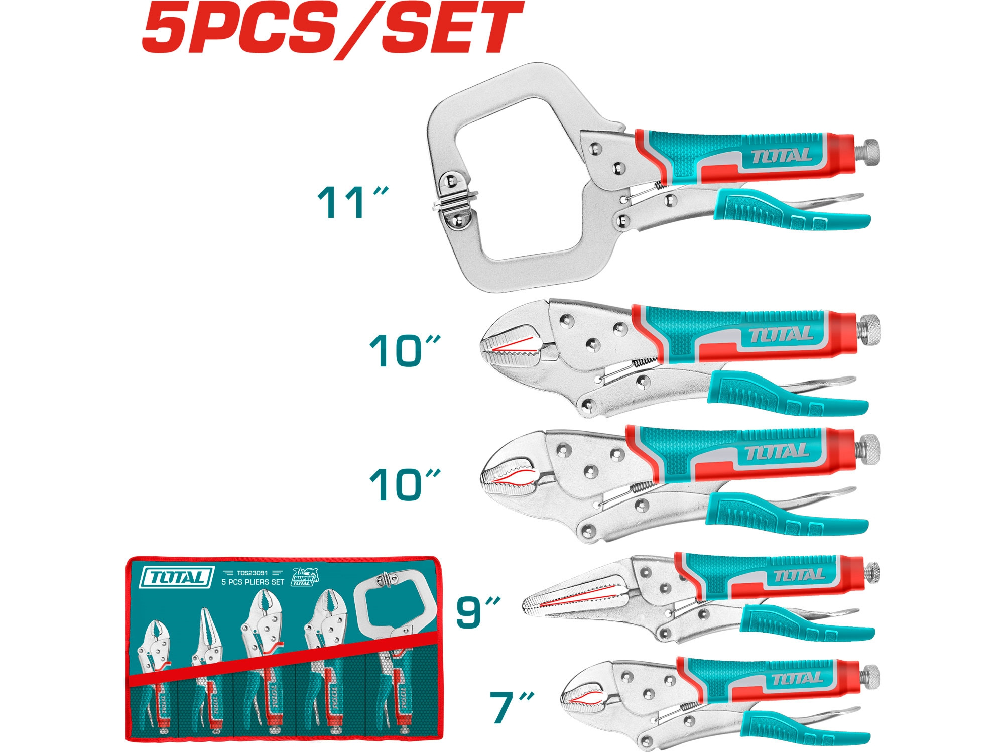 Sada rychloupínacích kleští je zabalena v rozkládacím obalu z PVC. Obal má 5 kapes, pro každé kleště jednu. Po zamotání obalu do ruličky je obal vybaven provázkem pro zavázání. Jednotlivé kleště jsou vybaveny sklolaminátovým krytím rukojetí, což usnadňuje úchop a práci s nůžkami. Sada obsahuje tyto typy kleští: 1 ks 180mm kleště se zahnutými čelistmi 1 ks 230mm kleště rychloupínací štípací s dlouhými čelistmi 1 ks 230mm kleště rychloupínací štípací se zahnutými čelistmi 1 ks 250mm kleště s přímými čelistmi 1 ks 280mm kleště rychloupínací C