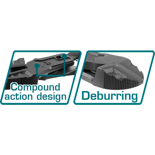 Velikost: 230 mm, Úspora energie 65% oproti běžným kleštím, Materiál: Cr-V,Povrchová úprava: teflonový povlak, TPR tříbarevná rukojeť pro pevné uchopení a pohodlí, S funkcí odhrotování, Baleno v polovičním dvojitém blistru.