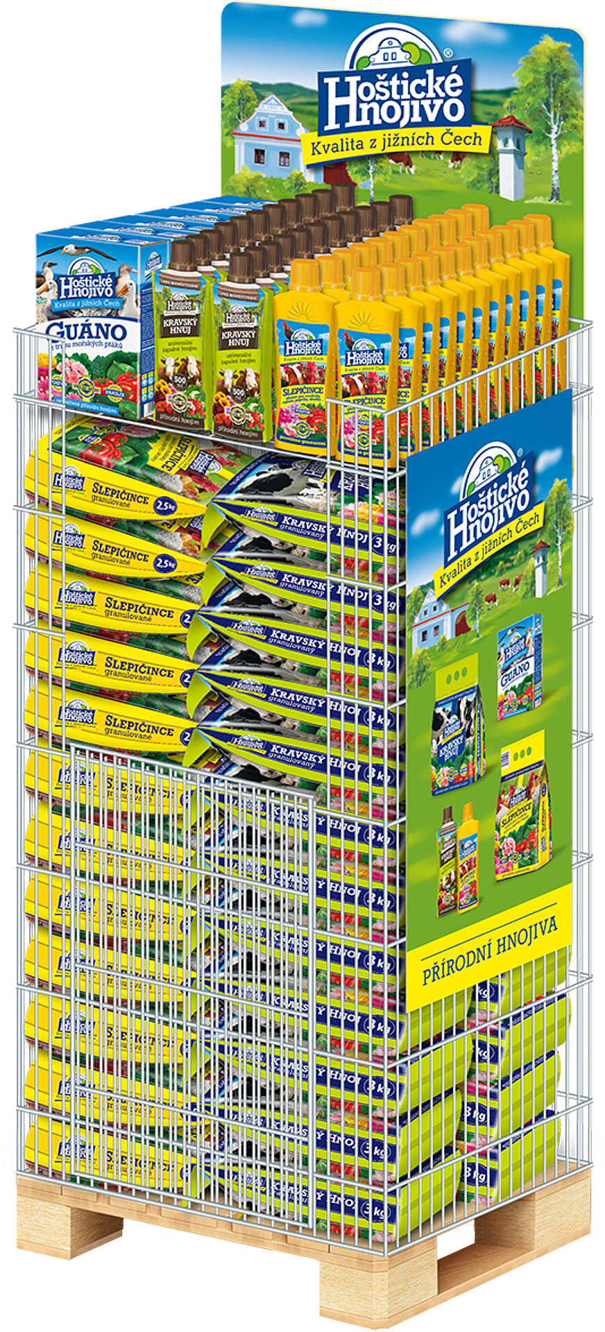 Drátěný koš umístěný na paletě pro efektivní prezentaci hnojiv Forestina.