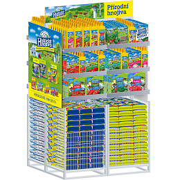 Drátěná klec umístěná na paletě pro efektivní prezentaci hnojiv Forestina.