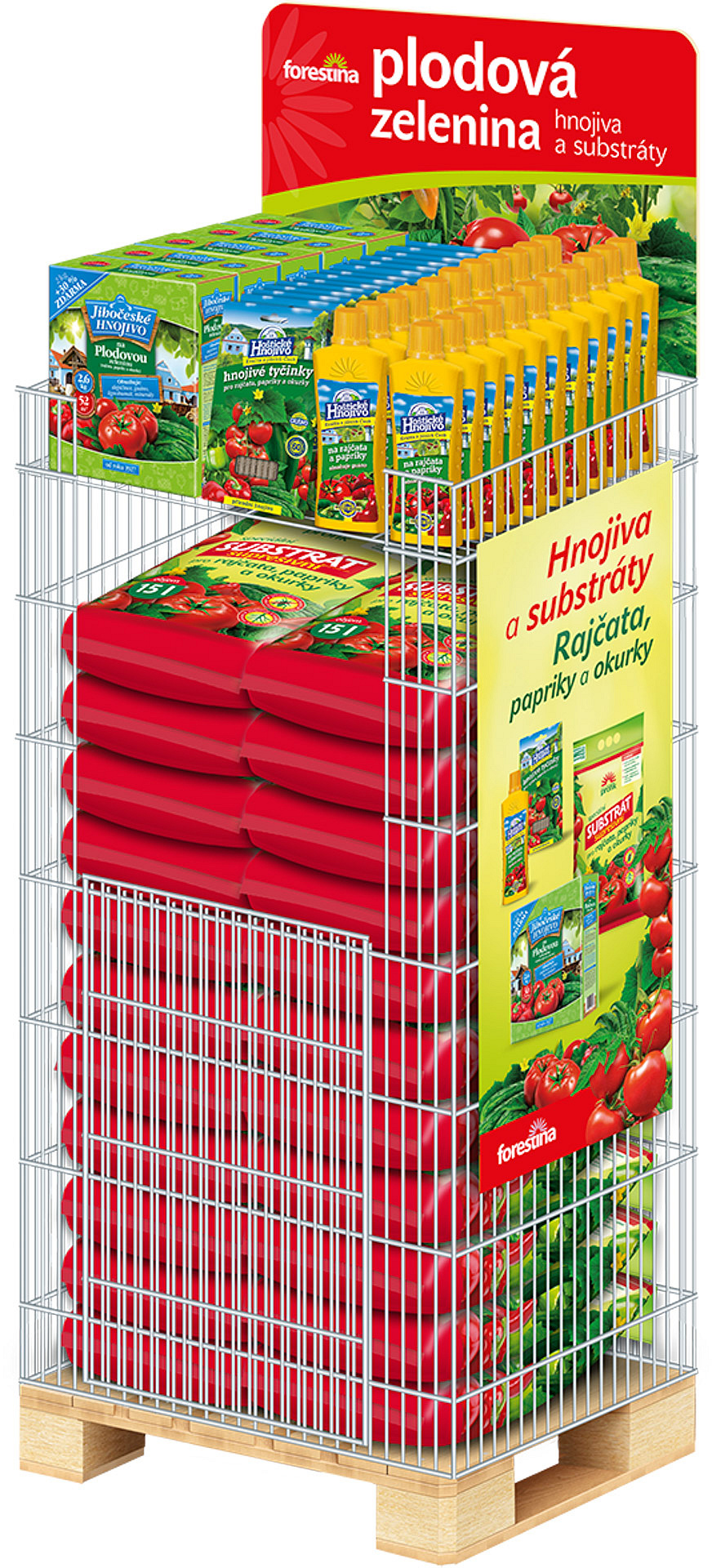 Drátěný koš umístěný na paletě pro efektivní prezentaci hnojiv a substrátů Forestina.