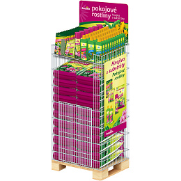 Drátěný koš umístěný na paletě pro efektivní prezentaci hnojiv a substrátů Forestina.
