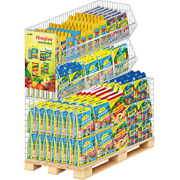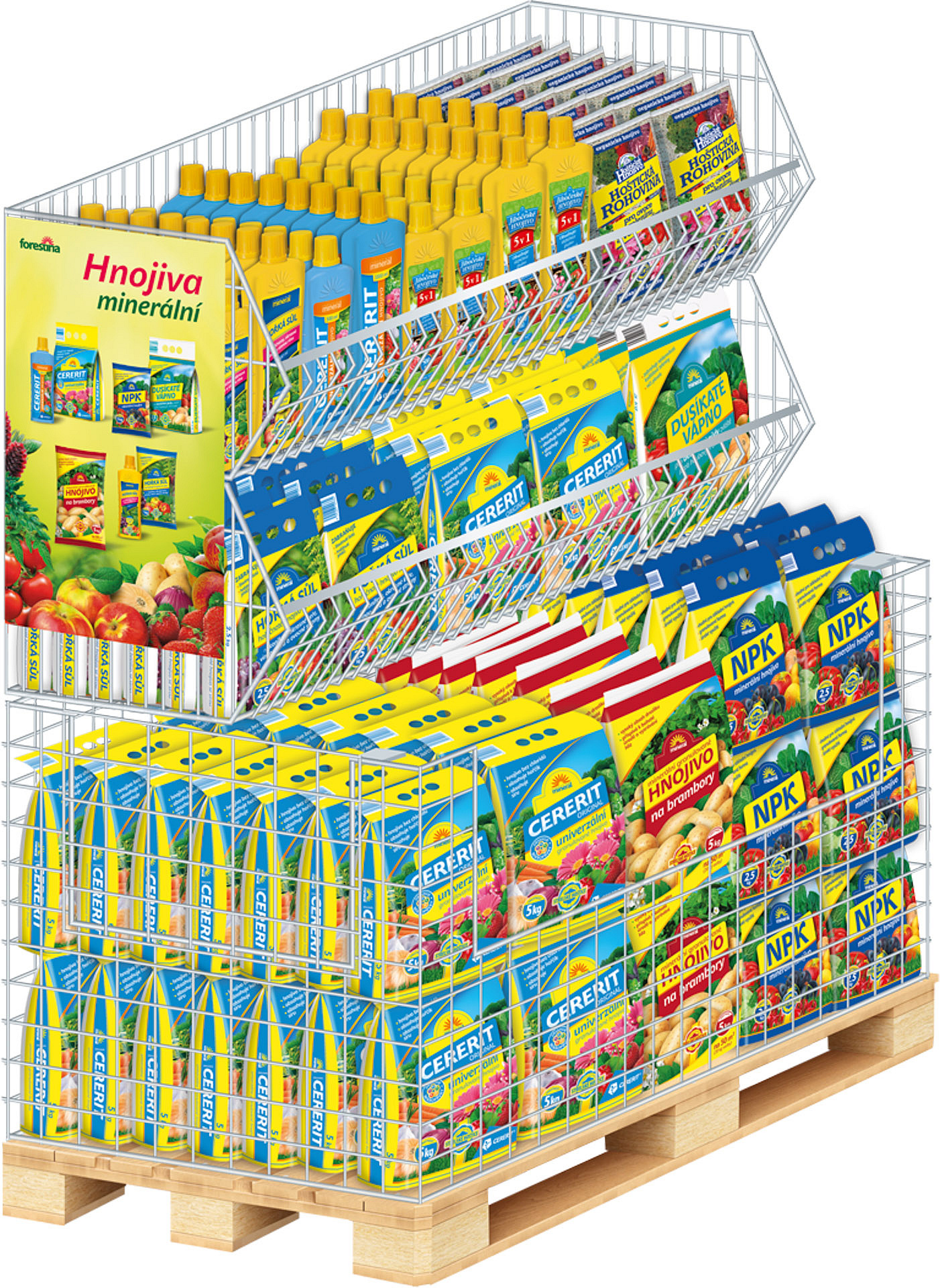 Drátěná klec umístěná na paletě pro efektivní prezentaci hnojiv a substrátů Forestina.