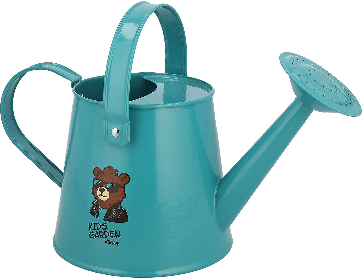 Dětská kovová konvička s kropítkem - modrá barva konvičky s obrázkem s dětským motivem.