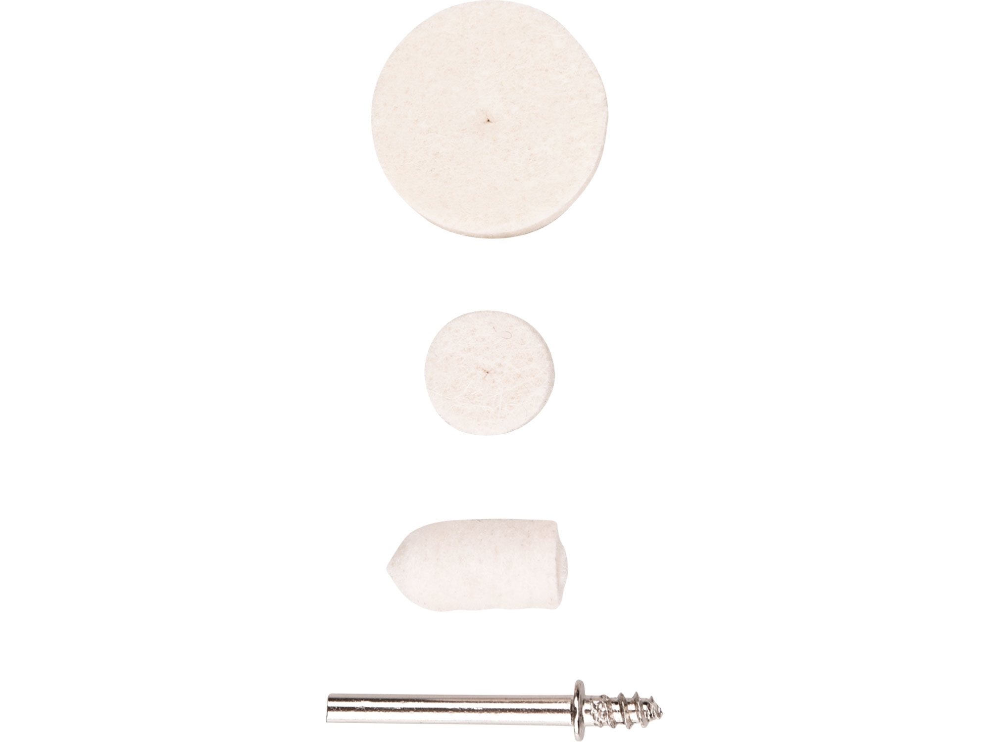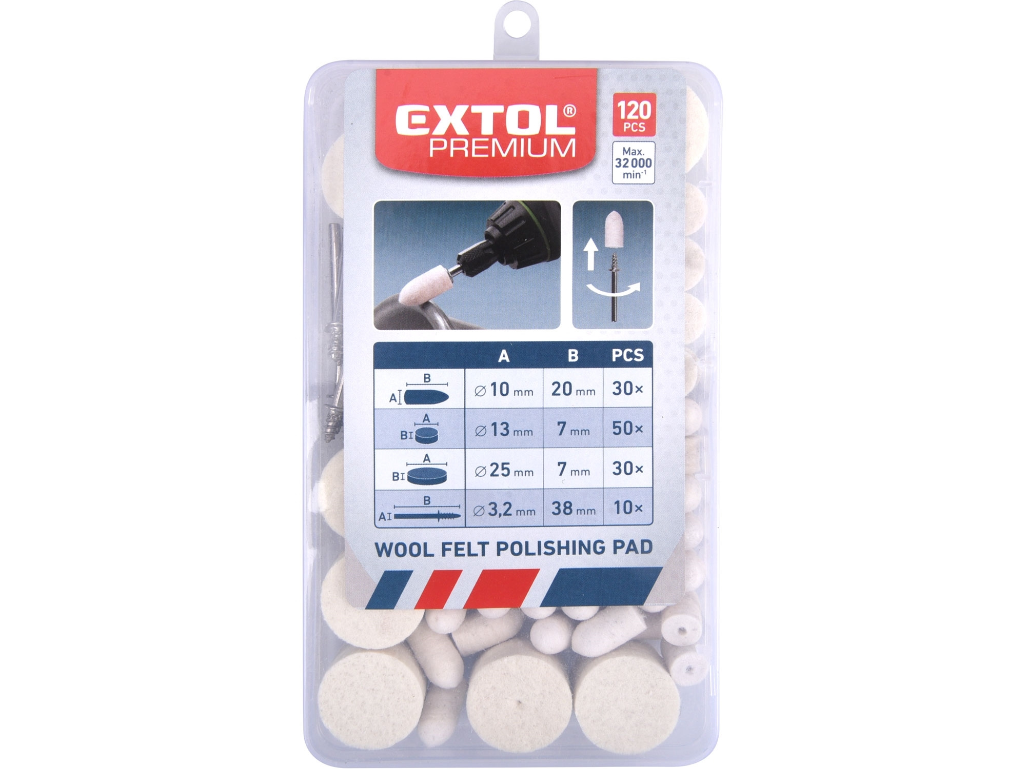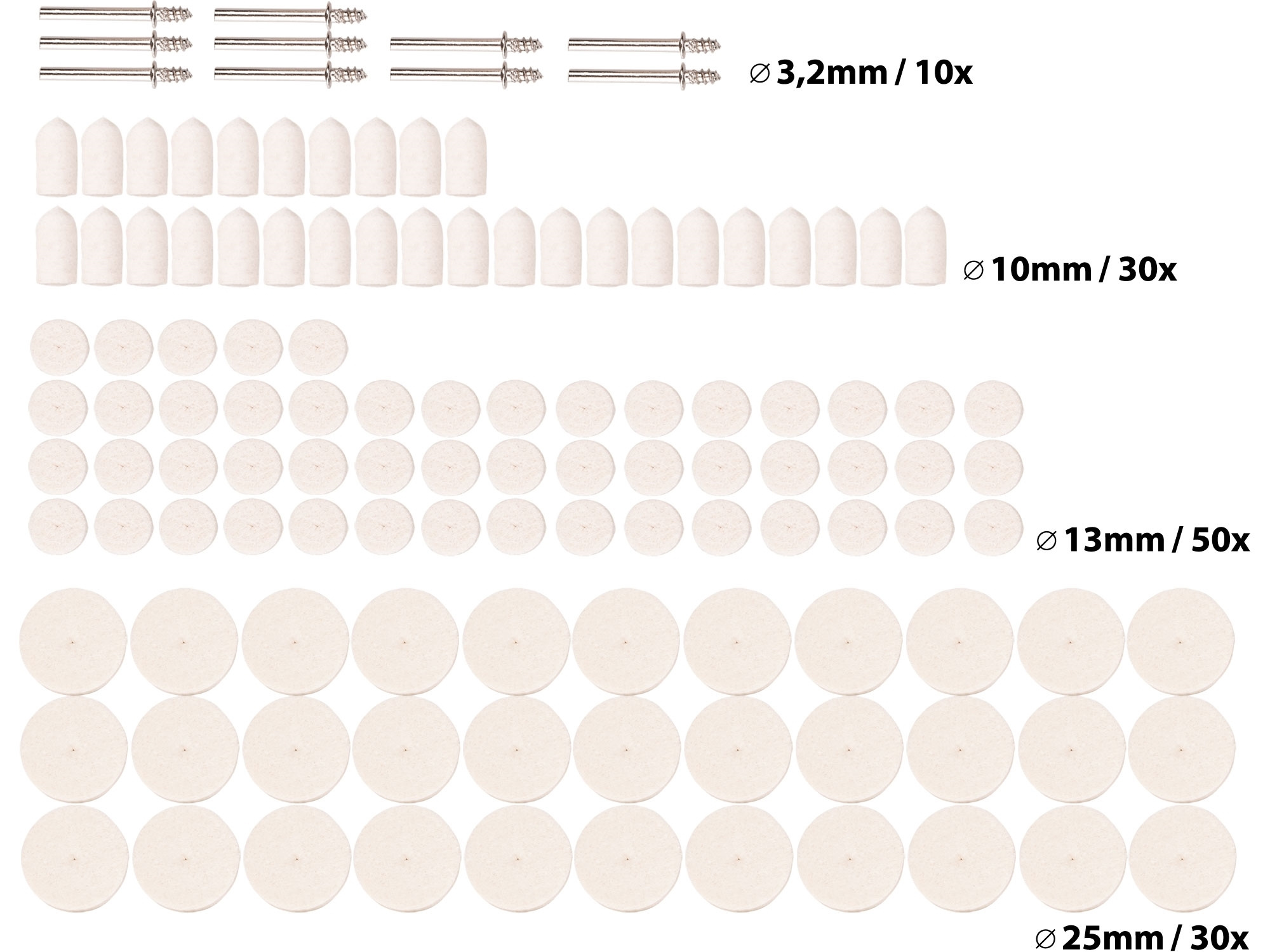 plstěné kotouče: ⌀10 x 20mm - 30x, ⌀13 x 7mm - 50x, ⌀25 x 7mm - 30x, unašeč 10x, stopka ⌀3,2mm, plastová krabička