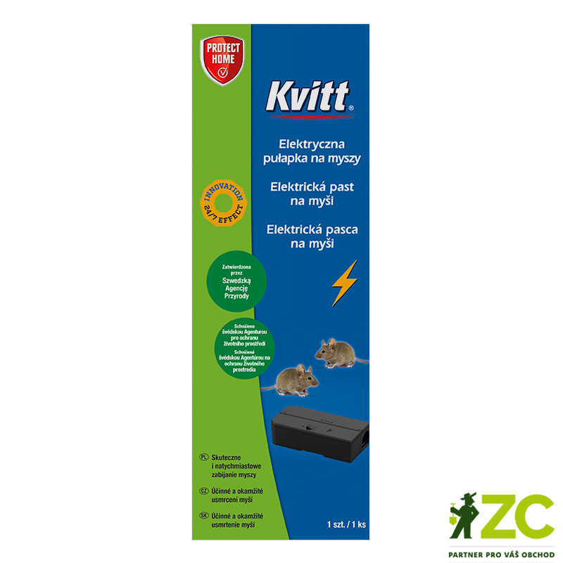 Elektrická past na myši Kvitt je velmi účinný a rychlý způsob kontroly myší. Myši jsou do pasti přilákány pomocí vložené návnady. Když se myš dotkne kovové destičky uvnitř, je usmrcena elektrickým proudem. Myši rychle a bezbolestně uhynou. Mrtvé myši lze snadno odstranit, aniž byste se jich dotkli. Elektrická past má řadu bezpečnostních prvků pro uživatele. Past funguje jak na napájecí kabel, který je součástí balení, tak na baterie (baterie nejsou součástí balení). Elektrické pasti jsou ve srovnání s jinými metodami hubení hlodavců účinnější a hygieničtější. Elektrická past na myši Kvitt je určena pro použití v interiéru a lze do ní chytit až 100 myší, než je třeba vyměnit baterie. Pro použití v interiéru.