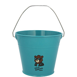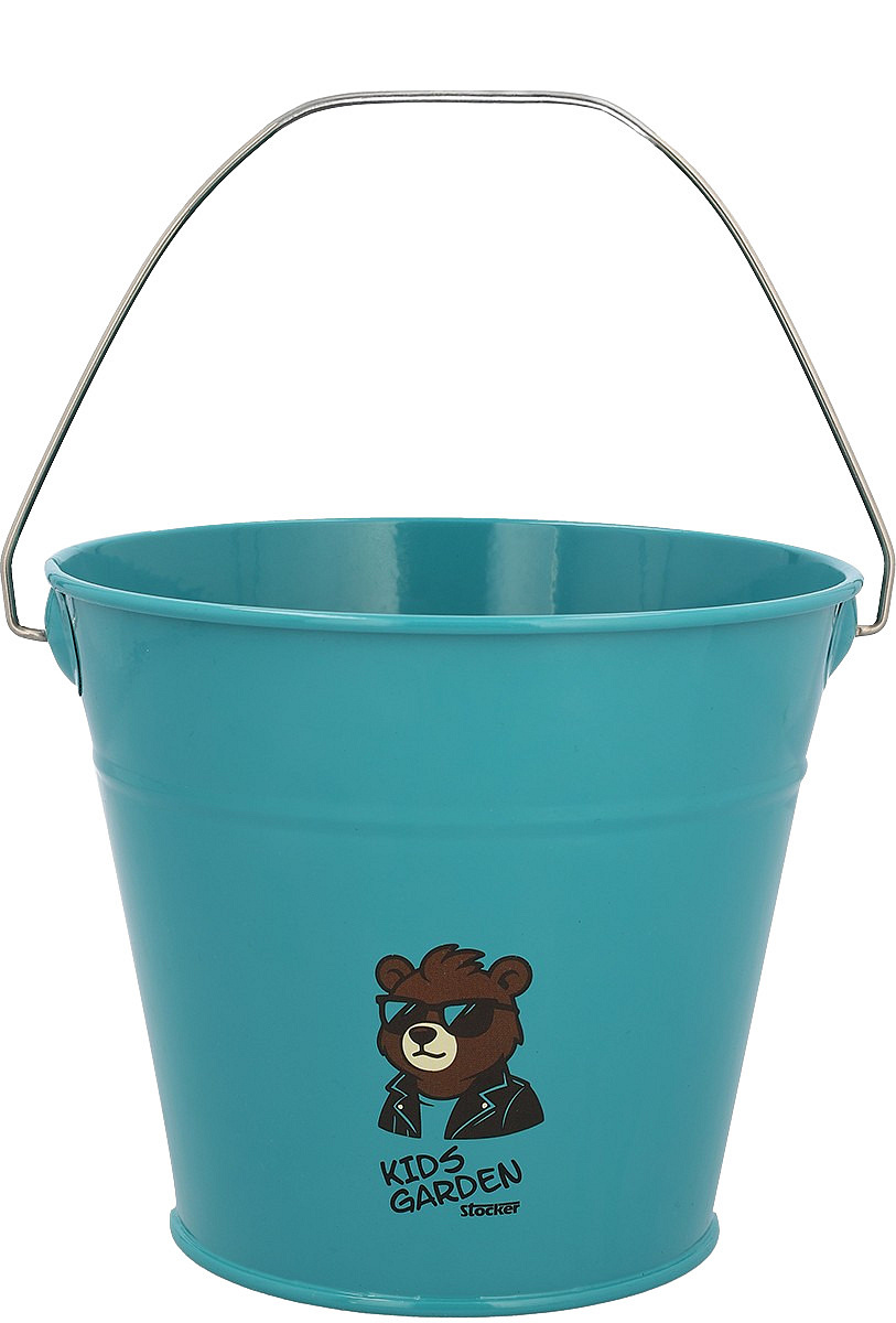 Dětský kovový kyblík v modré barvě s obrázkem s dětským motivem. Vhodné pro přepravu zeminy, vody, písku, díky čemuž je zahradničení zábavnější.