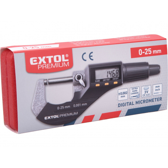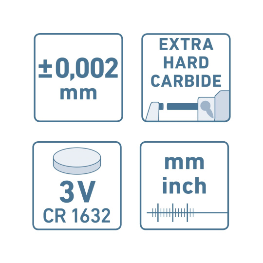 rozlišení 0,001mm, přesnost ±0,002mm, baterie 3V typ CR1632, baleno v plastovém kufříku
