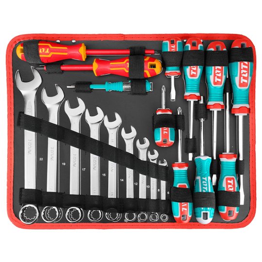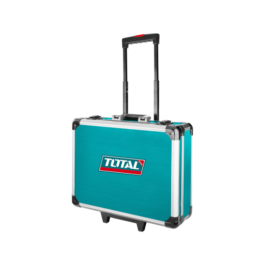 Bohatá sada obsahující nejrůznější ruční nářadí od kleští, přes gola sadu až po vodováhu. Vše uloženo v praktickém kufru s kolečky a výsuvnou rukojetí.