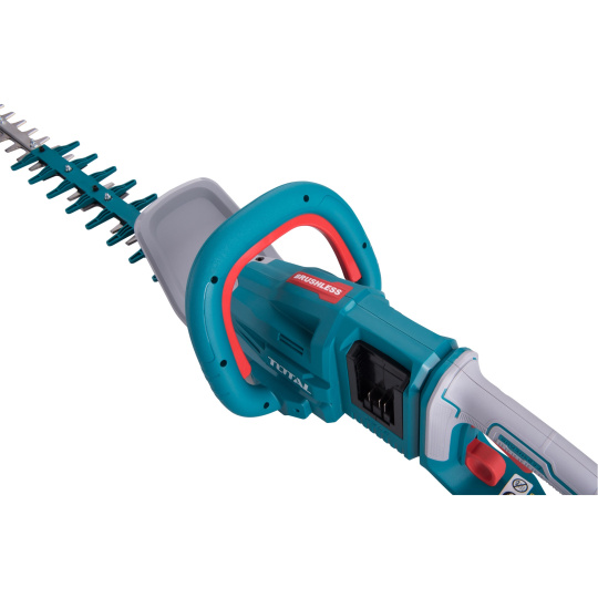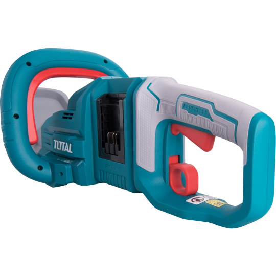 Tyto akumulátorové nůžky jsou určeny ke stříhání živého plotu, keřů, křovin a nově vzrostlých větví v domácích zahradách. Jedná se o novinku společnosti Total. Nůžky jsou napájeny dvěma bateriemi 2000mAh, čímž docílí vyššího výkonu a delší pracovní doby nůžek. Nůžky v sobě mají integrovány 3 pojistky proti spuštění, jsou vybaveny nejmodernějším bezuhlíkovým motorem a pogumovanou rukojetí, která se osvědčila jako protiskluzová. Tyto nůžky jsou součástí populární řady P20S, tedy řady 180 výrobků na jednu baterii. Pokud tedy již vlastníte nějaký bateriový výrobek z řady Total 20V, nemusíte dokupovat k tomuto výrobku baterii a nabíječku. Můžete ji použít z již zakoupeného výrobku. Nepřítomnost napájecího kabelu poskytuje svobodu a komfort při práci a manipulaci s nářadím. Nářadí lze tak s výhodou použít pro práci v místech, kde není možné použít elektrické nářadí s napájecím kabelem z důvodu nedostupnosti distribuční elektrické sítě.
