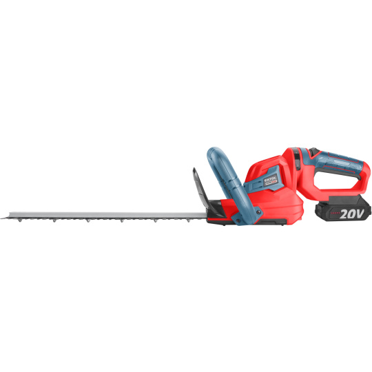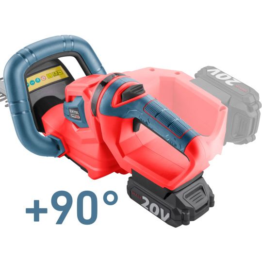 Aku nůžky jsou určeny ke stříhání živého plotu až se středně silnými větvičkami v domácích zahradách. Maximální průměr střihaných větví je 16mm. Ostrá stříhací čepel si snadno poradí s živým plotem a je osazena hliníkovou lištou, která ji chrání před poškozením. Tuto čepel lze otáčet až o 90˚ což usnadňuje stříhání ve vertikální i horizontální poloze. Proti odletujícím kouskům větví je uživatel chráněn pevným plastovým krytem. Stroj je vybaven bezpečnostní pojistkou, která se aktivuje při vyklouznutí z rukou a elektronickou doběhovou brzdou, která zajistí jeho rychlé zastavení. Pogumovaná rukojeť brání vysmeknutí, tlumí vibrace a zpříjemňuje držení při práci. Nůžky jsou navrženy tak, aby byly lehké a ergonomické. Mají dobře vyváženou konstrukci, která snižuje namáhání rukou a zad při delší práci. Díky napájení z baterie již není nutné dávat pozor na napájecí kabel a manipulace s nimi je pohodlnější. Také nikoho nebude rušit hlukem, který vydávají benzínové modely. Aku nůžky nevyžadují složitou péči. Stačí je pravidelně čistit, udržovat ostří čepele a kontrolovat stav baterie. Pro běžnou práci dostačují jeden nebo dva 2Ah akumulátory, které můžete rychle nabít v rychlonabíječce, pro náročnější nebo delší práci doporučujeme větší akumulátory s kapacitou 4–8Ah. Akumulátor má indikátor nabití a lze použít ve všech typech nářadí řady EXTOL SHARE20V. Díky použité Li-ion technologii je ho možné kdykoliv dobíjet, aniž by se tím snižovala jeho kapacita. Li-ion akumulátor ztrácí energii vlivem samovybíjení velmi pomalu a vydrží dlouho nabitý a připravený k použití.