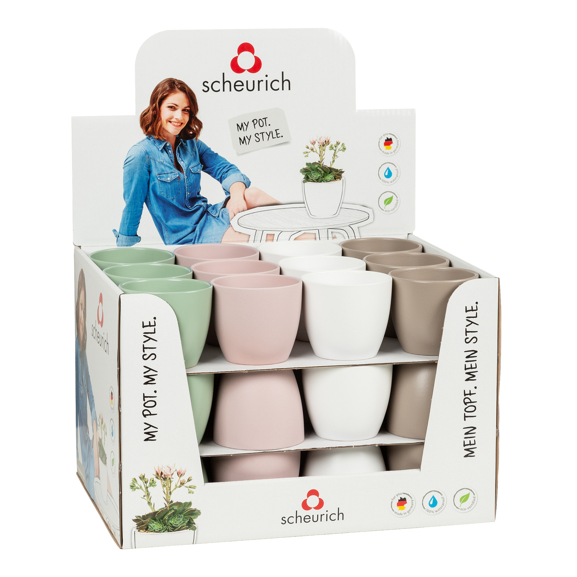 Keramické obaly značky Scheurich v nadčasovém designu. Při zakoupení 36 ks dostanete květináče v praktickém boxu.