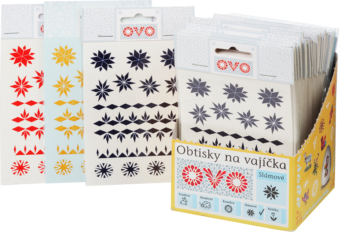 Slámové obtisky na velikonoční vajíčka. Na 1 aršíku vždy 12 motivů. Snadná aplikace pomocí vody. Oživte své velikonoční vajíčka imitací dekorů, které navozují vzhled tradičních kraslic.