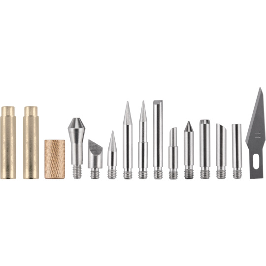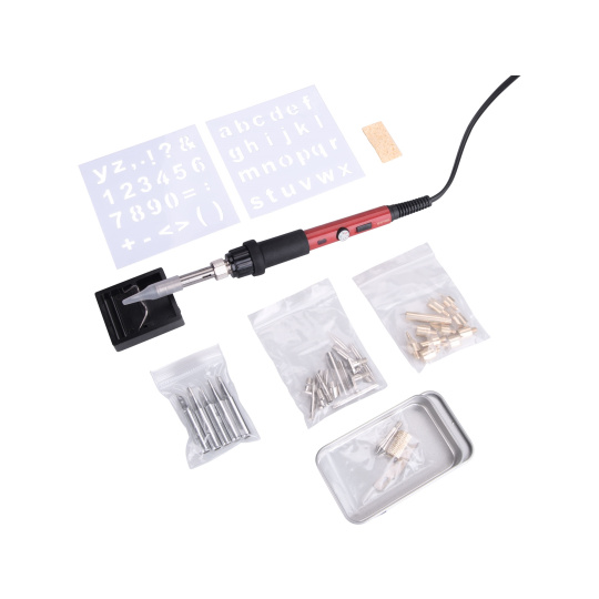 Hrotová pájka je určena k měkkému pájení, které vyžaduje přesnost a kontrolu teploty hrotu, zejména v elektronice a v bižuterii. S použitím vhodného hrotu lze pájku použít také k vypalování symbolů do dřeva, drobnému řezání či spojování plastů. S pájkou se používají standardní hroty typu 900M. Hrot pájky je nahříván keramickým tělesem s vnitřním topícím prvkem. Pomocí regulačního kolečka nastavíte teplotu v rozsahu 220–480°C. Plastový přechod mezi kovovou a plastovou částí je vyroben ze speciálního vysoce tepelně odolného plastu a ručka je potažená silikonem pro příjemné držení při práci. Součástí balení je 6 hrotů pro pájení, 30 hrotů pro vypalování do dřeva v plechové krabičce, 2 šablony pro kreslení písmen a čísel a jednoduchý stojánek pro odložení pájky. Vypalovací hroty lze použít s jakoukoliv pájkou pro hroty 900M. Pájka je se vším příslušenstvím uložena v měkkém pouzdře.