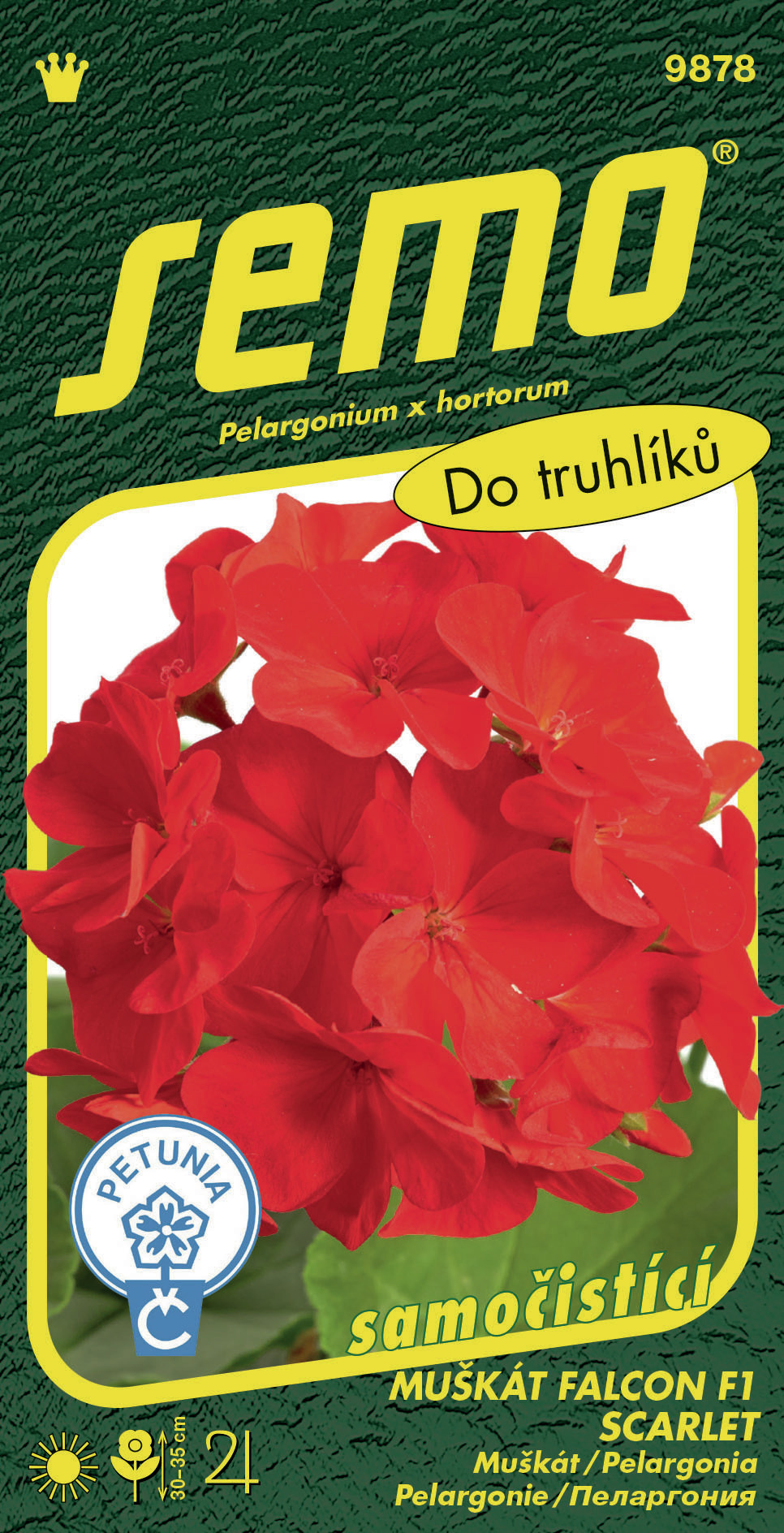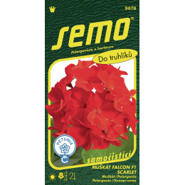 FALCON F1 SCARLET (kód 9878) – revoluční odrůda muškátů pěstovaných ze semen. Rostliny jsou dobře větvené a kompaktní, bez květenství vysoké 25 cm (s květenstvím 35 cm). Květenství jsou pevná, o průměru 10–11 cm. Květy o velikosti asi 4 cm jsou jasně červené. Rostliny výborně snáší jak slunečné polohy, tak i polostín. Vhodné jsou do nádob, závěsných košů i záhonů. Ve velkých výsadbách získáte bohatě kvetoucí záhon, který díky samočistícímu efektu nepřestává kvést.
