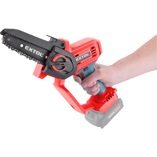 Jednoruční řetězová aku pila je určena k prořezávání stromů a keřů a pro drobné zkracovací řezy dřeva na zahradě, v dílně apod. Aku řetězová pila spojuje výhody elektrických pil – nízký hluk, jednoduchost obsluhy a údržby se svobodou pohybu u benzínových pil. Tato malá aku pila váží jen 1,8kg a je dostatečně robustní na to, aby si snadno poradila s větvemi, ale zároveň dostatečně lehká na to, aby se dala ovládat jednou rukou. Je vybavena kvalitní vodící lištou a pilovým řetězem. Pila má také systém pro snadnou a rychlou výměnu řetězu a mechanismem pro jednoduché vypnutí řetězu. Vysokou bezpečnost zajišťují tři prvky: horní chránič řetězu, chránič rukou, který vás chrání před pořezáním, poškrábáním a škrábanci a spínačem s pojistkou zabraňující náhodnému spuštění. Pogumovaná rukojeť brání vysmeknutí, tlumí vibrace a zpříjemňuje držení při práci. Akumulátor je vybaven ukazatelem nabití, což umožňuje uživateli si rozvrhnout délku práce a dát si včas nabít další akumulátor. Pro běžnou práci dostačují jeden nebo dva 2Ah akumulátory, které můžete rychle nabít v rychlonabíječce, pro náročnější nebo delší práci doporučujeme větší akumulátory s kapacitou 4–8Ah. Akumulátor lze použít ve všech typech nářadí řady EXTOL SHARE20V. Díky použité Li-ion technologii je ho možné kdykoliv dobíjet, aniž by se tím snižovala jeho kapacita. Li-ion akumulátor ztrácí energii vlivem samovybíjení velmi pomalu a vydrží dlouho nabitý a připravený k použití.